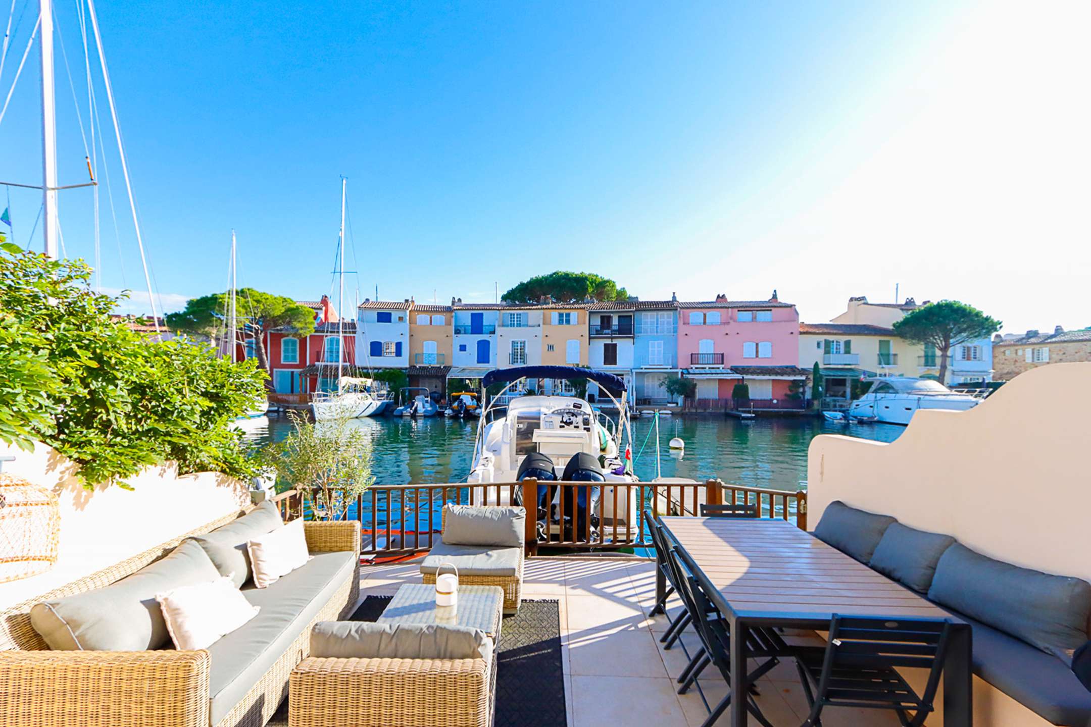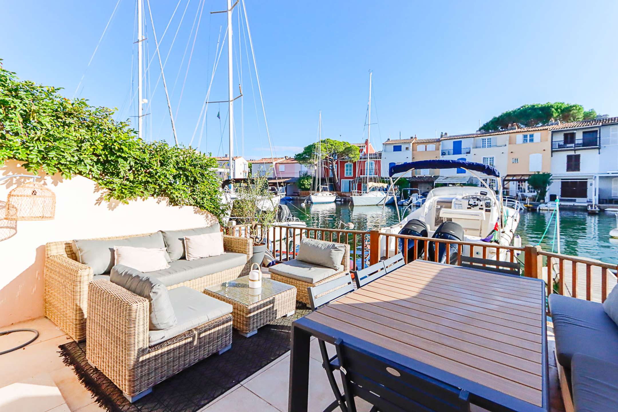 On the canal side, a wide terrace done as a living area and a dining area with a big table.