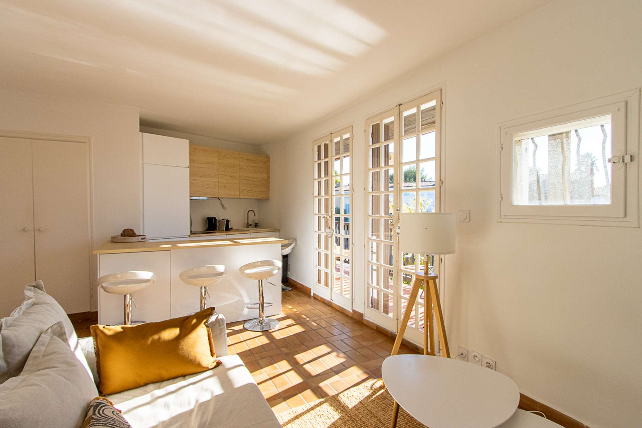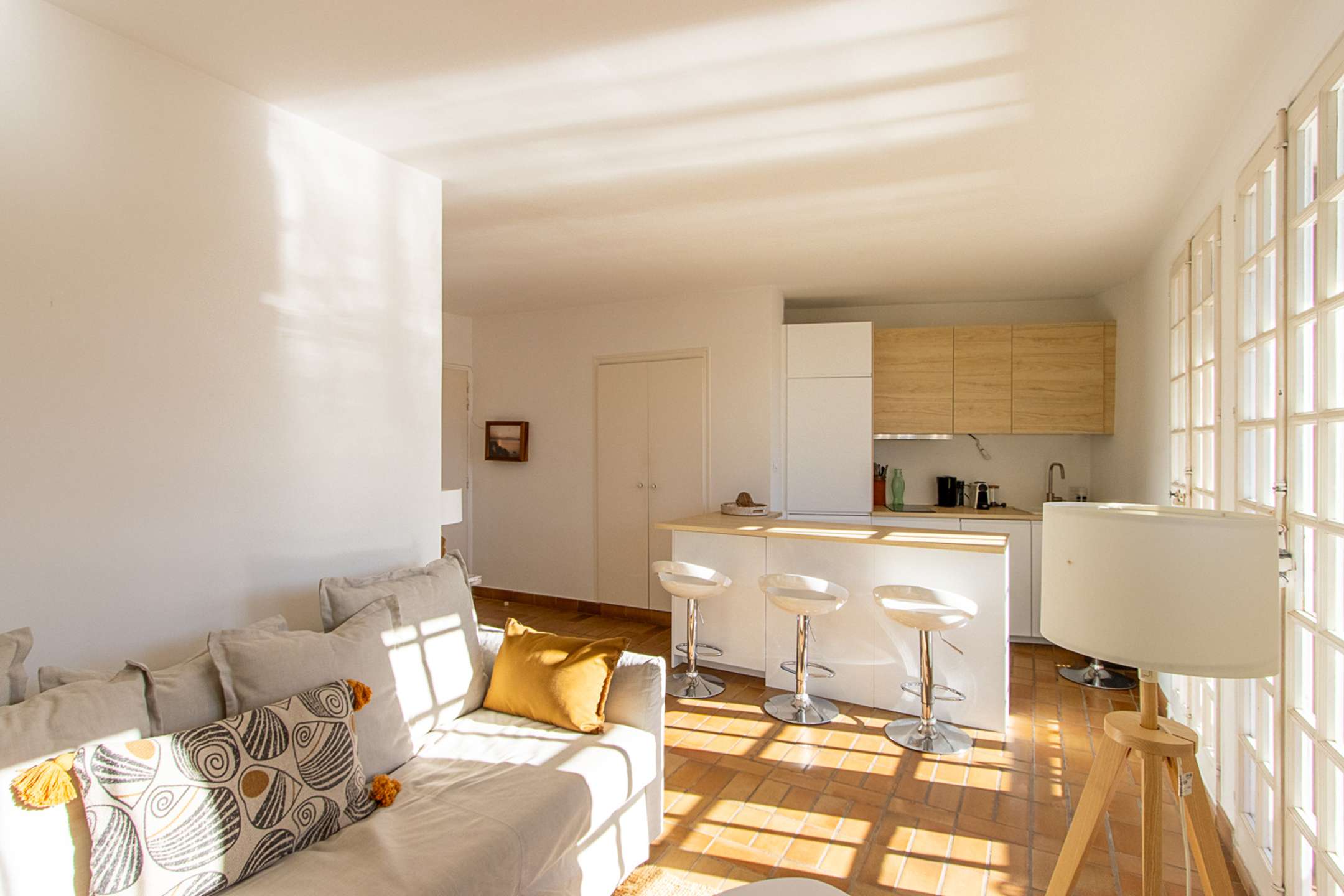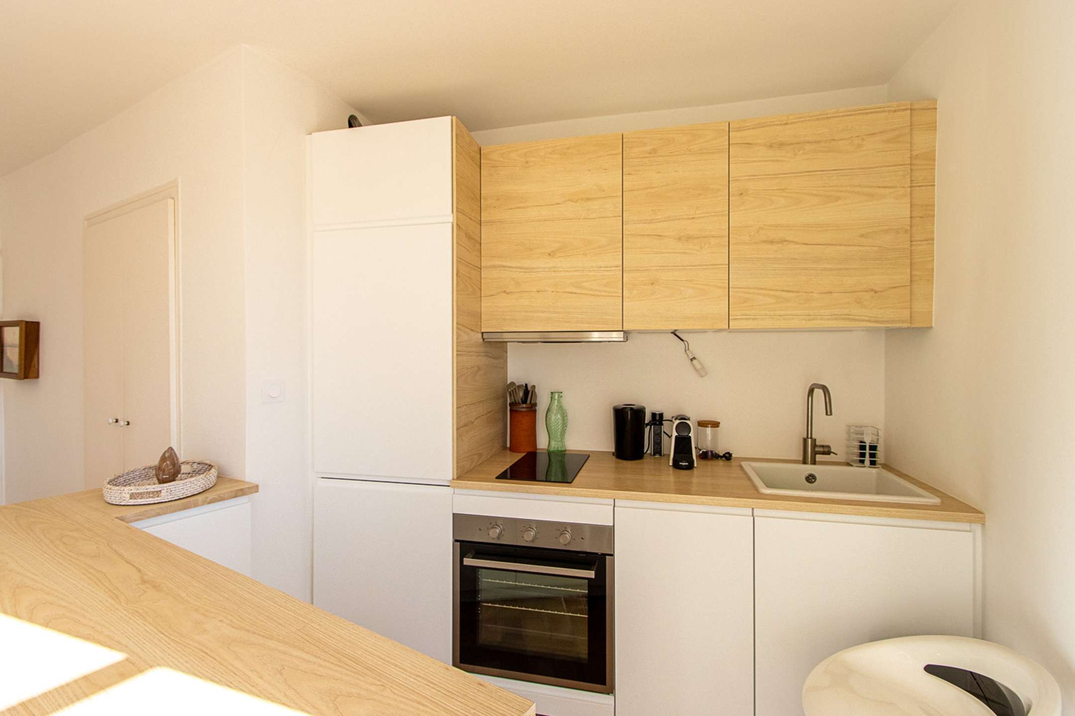 It is composed of a living-room with an open-plan kitchen (washing-machine, dishwasher, Nespresso coffee machine, kettle, toaster, oven, fridge, freezer) and a sofa-bed, 1 bedroom with a double bed (160cm) and a shower-room.