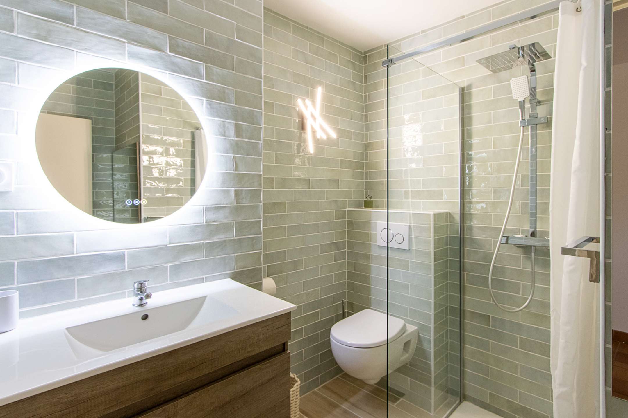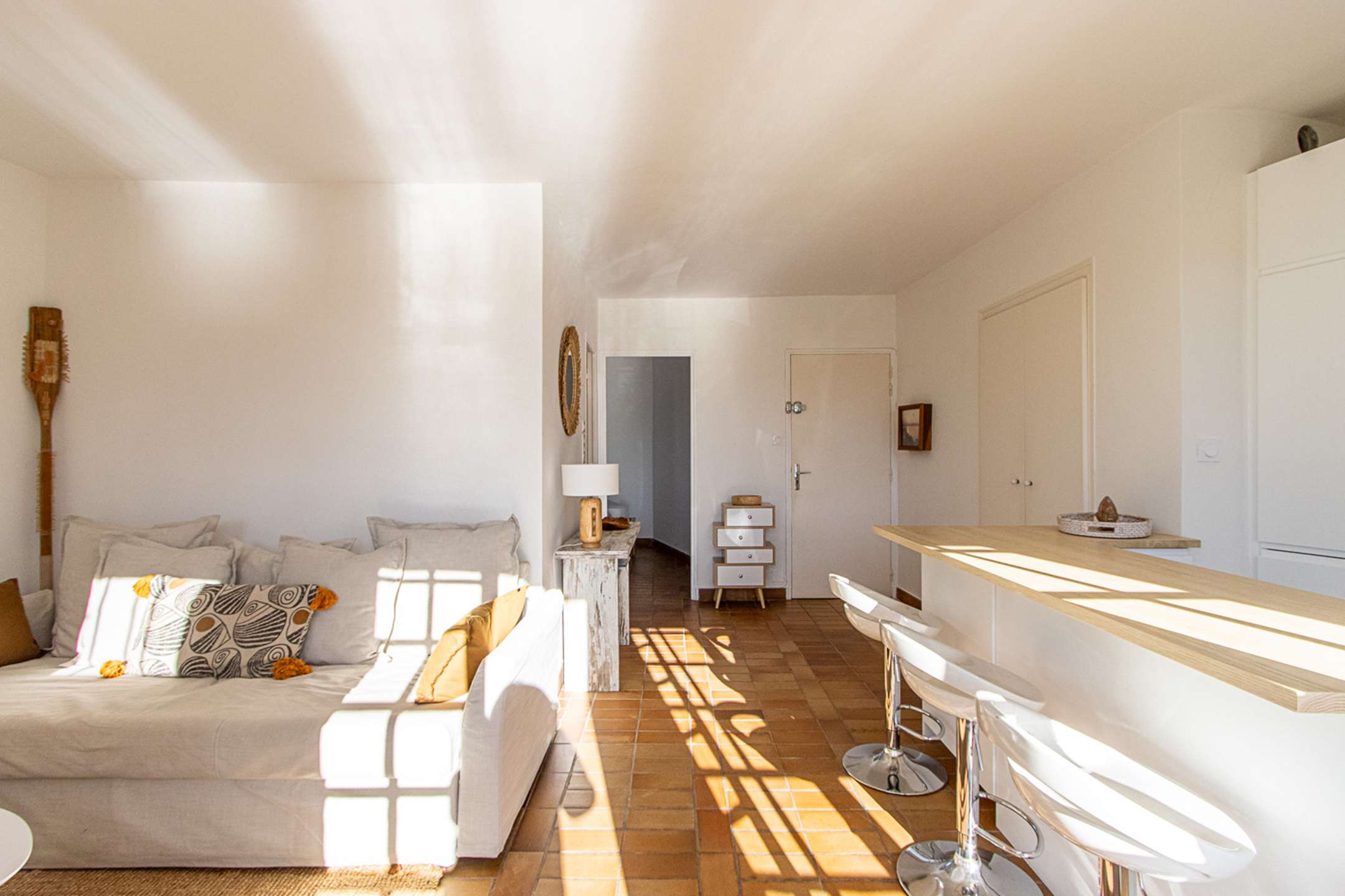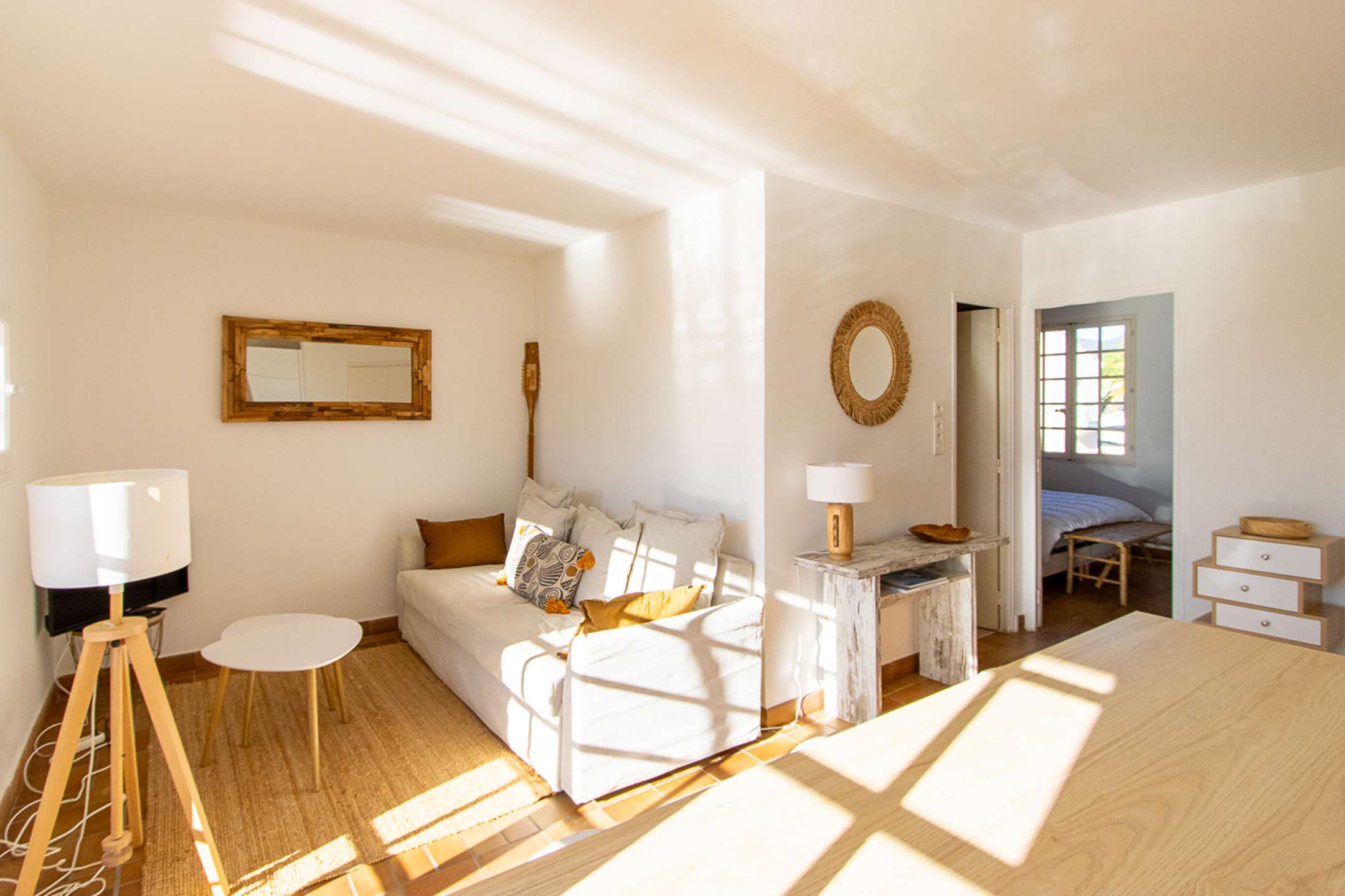 It is composed of a living-room with an open-plan kitchen (washing-machine, dishwasher, Nespresso coffee machine, kettle, toaster, oven, fridge, freezer) and a sofa-bed, 1 bedroom with a double bed (160cm) and a shower-room.