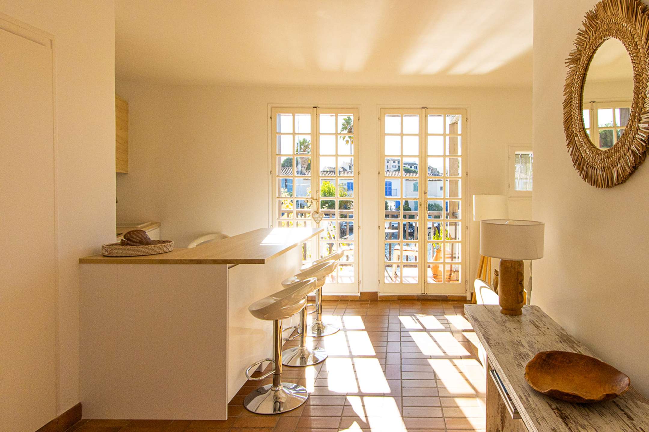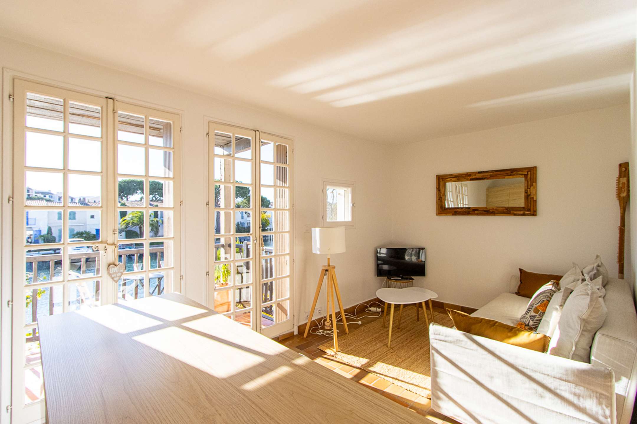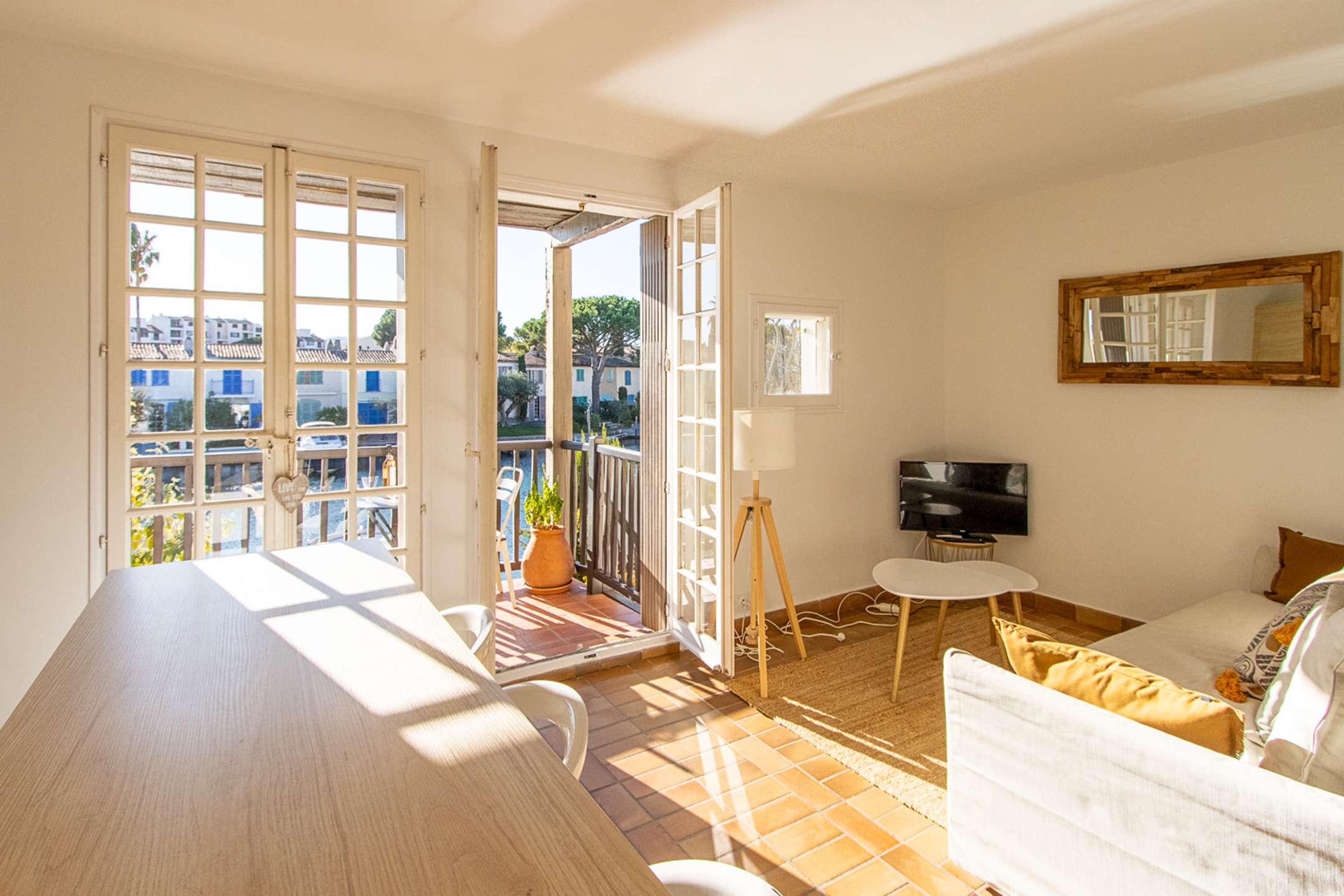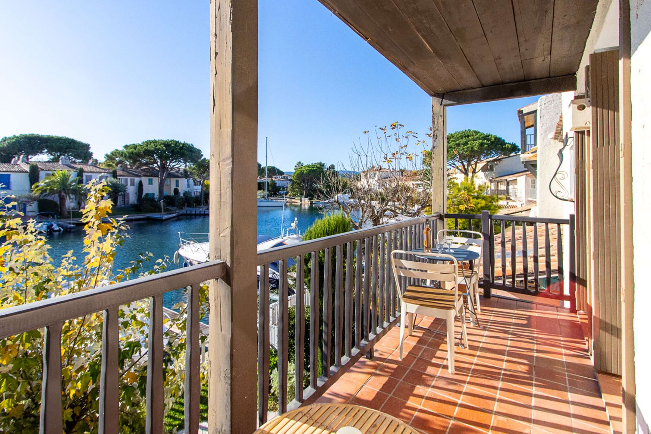 A wide sunny balcony with a beautiful view on the canal and the boats.