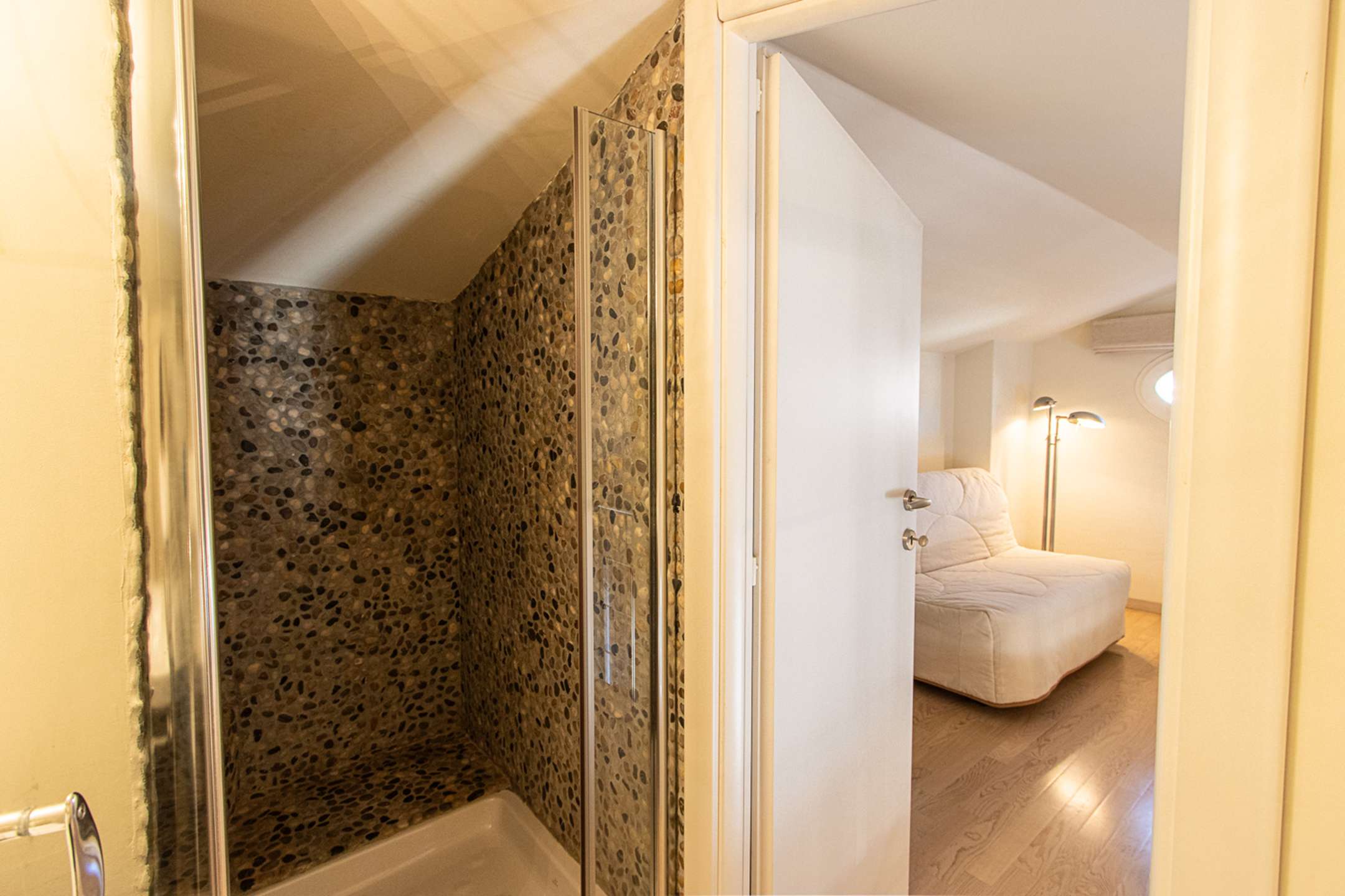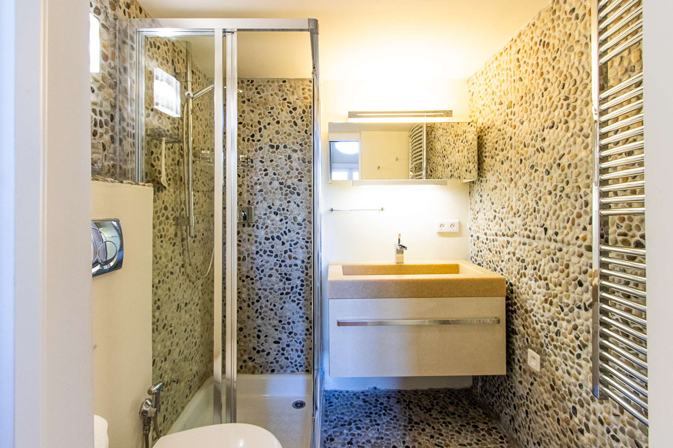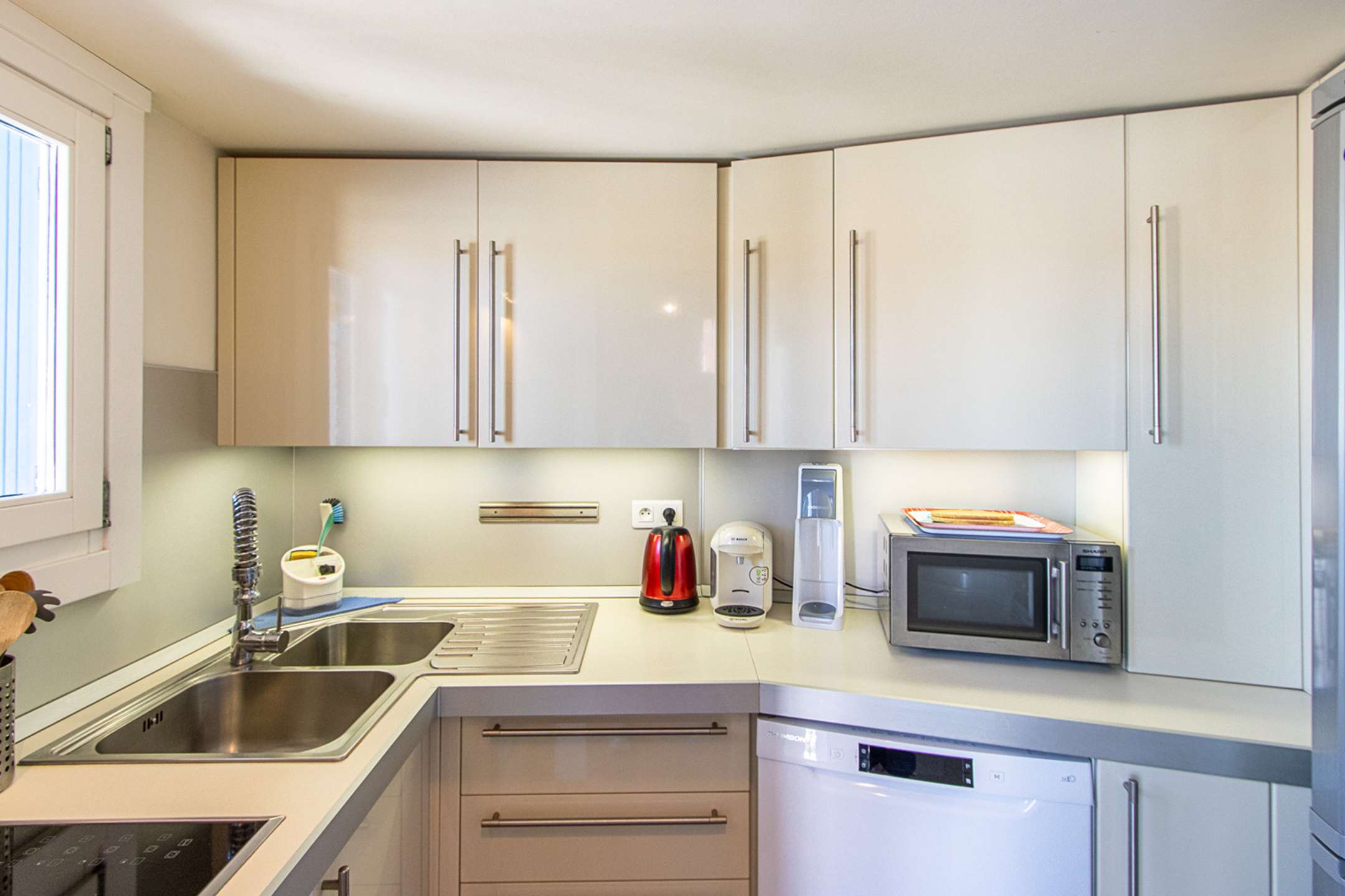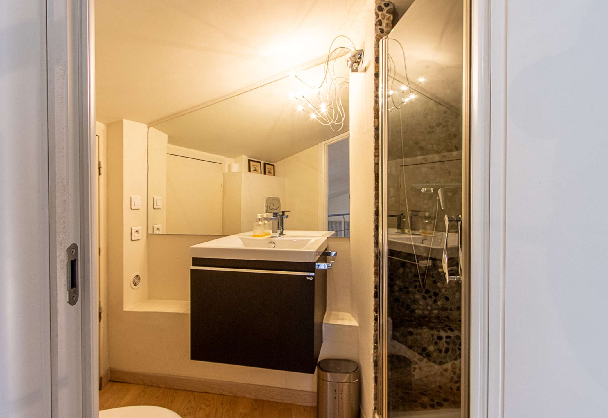 It is composed of a living-room opening onto the balcony, a well-furnished separated kitchen (dishwasher, washing-machine, fridge, freezer, microwave, Tassimo coffee machine, kettle, toaster), a bedroom with a double bed and its en-suite shower-room, indepedent toilets, and a large mezzanine with a sofa-bed and a shower-room with toilets.