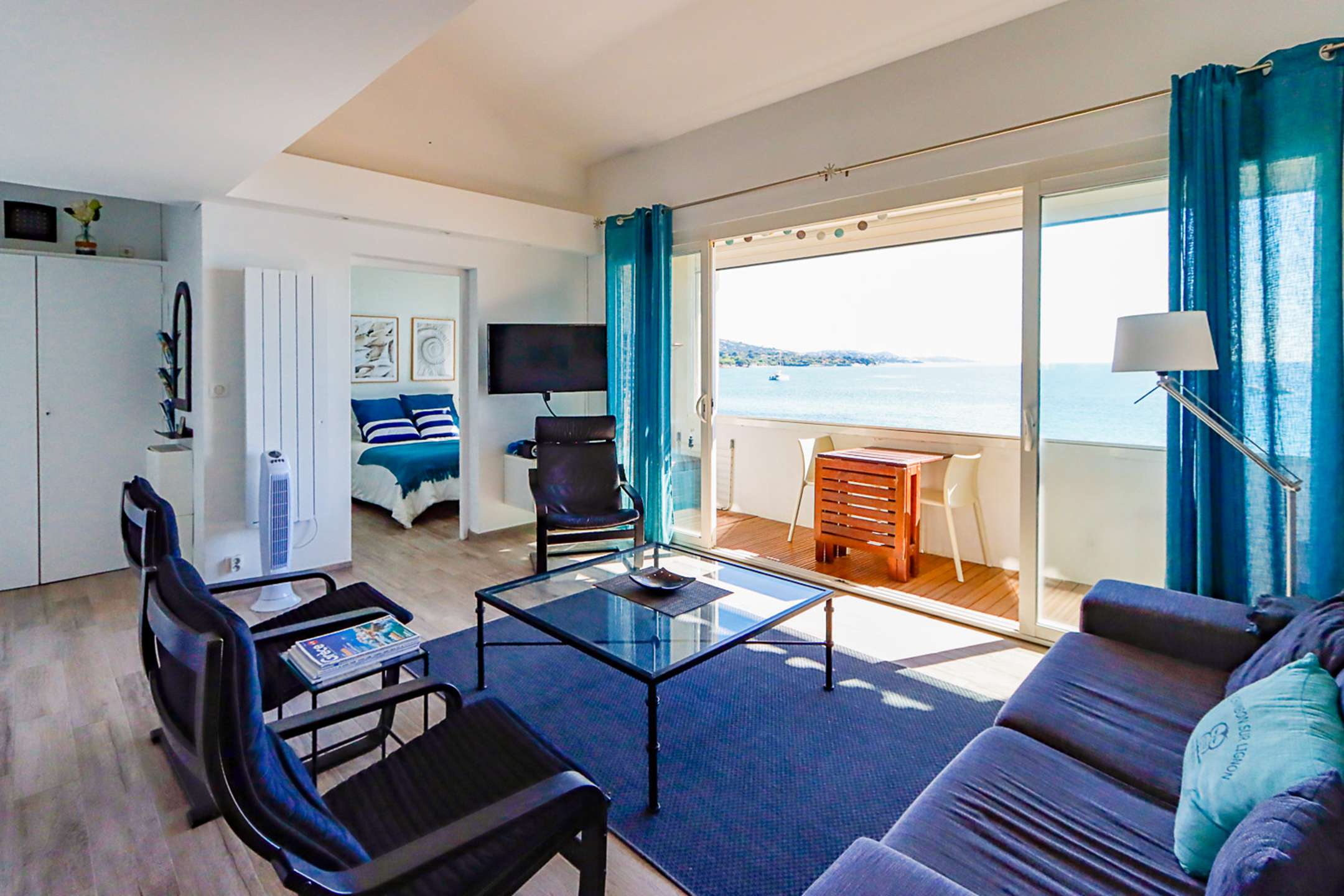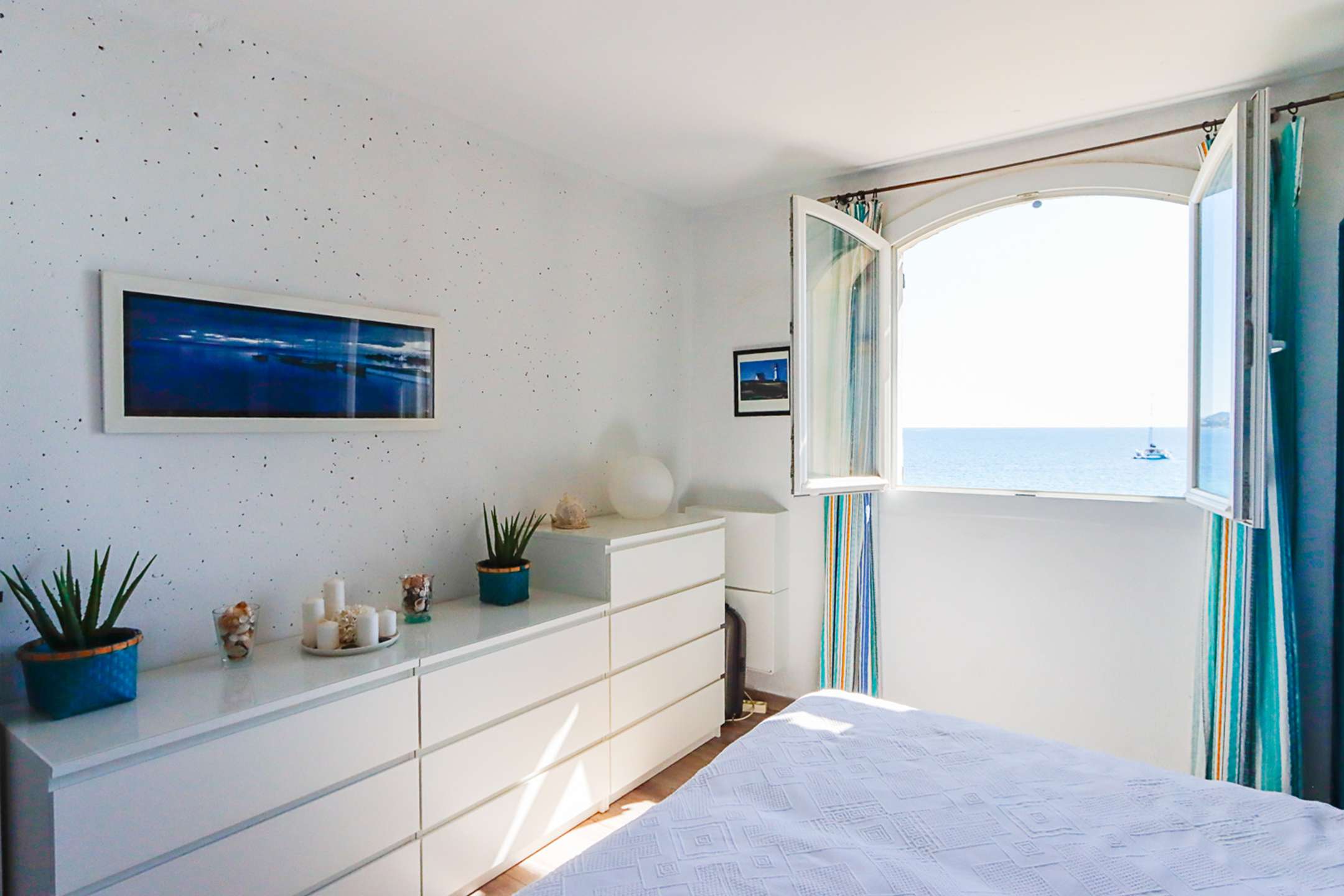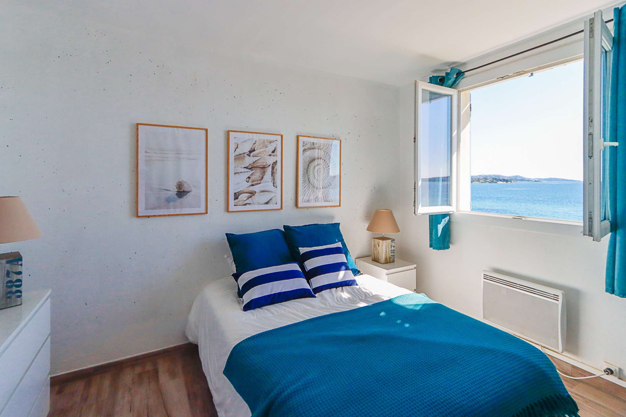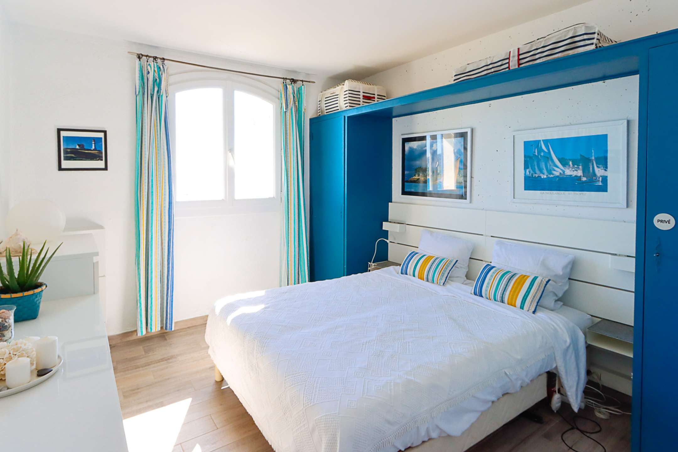 The apartment is composed of a bright dual aspect living-room, a separate kitchen (washing-machine, dishwasher, oven, microwave, Nespresso coffee-machine, fridge with a freezer), a shower-room, separate toilets, 2 bedrooms with a double bed (160cm and 140cm) and sea view and 1 bedroom with a double bed (140cm) and a view on Port Grimaud.