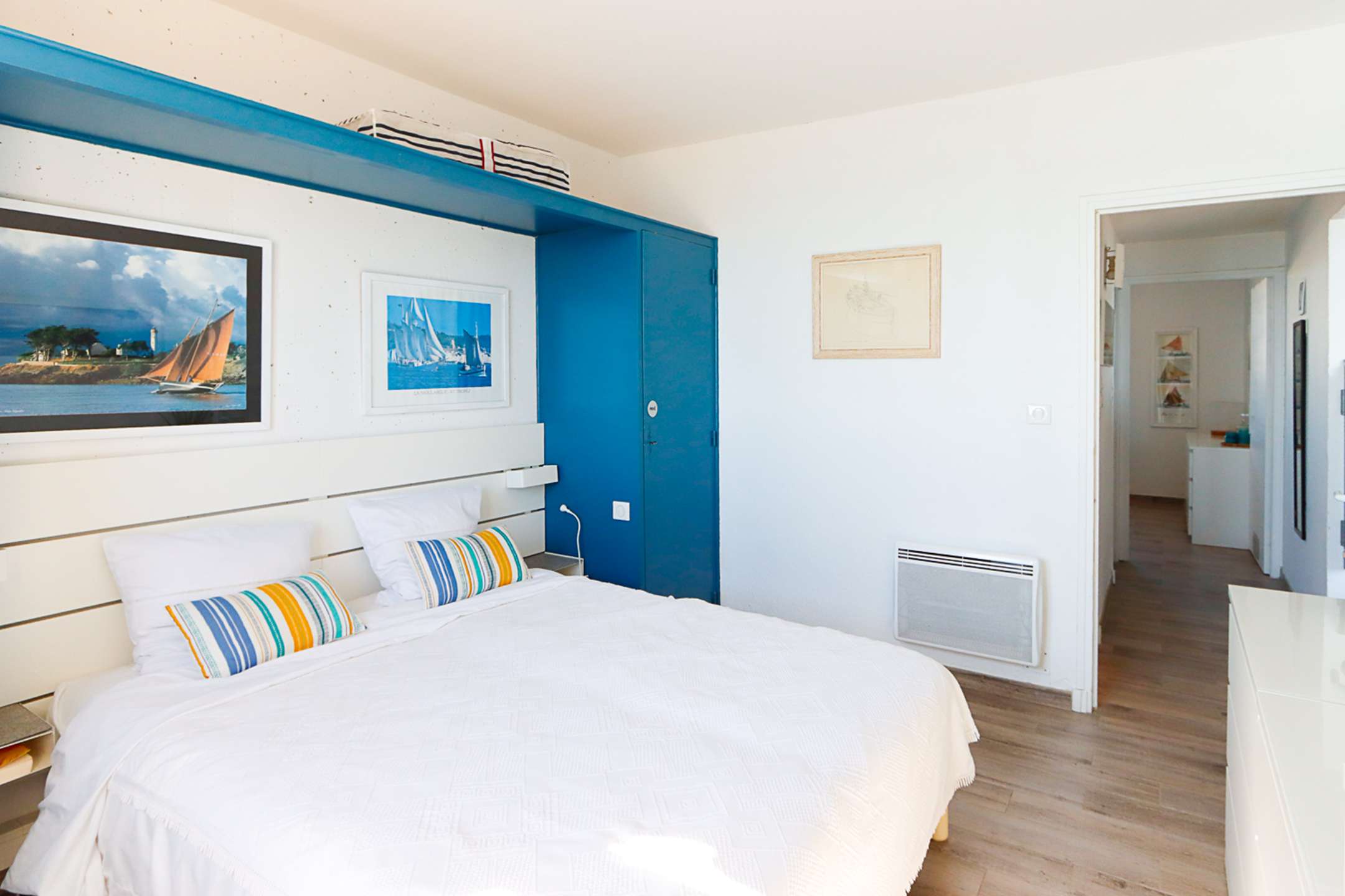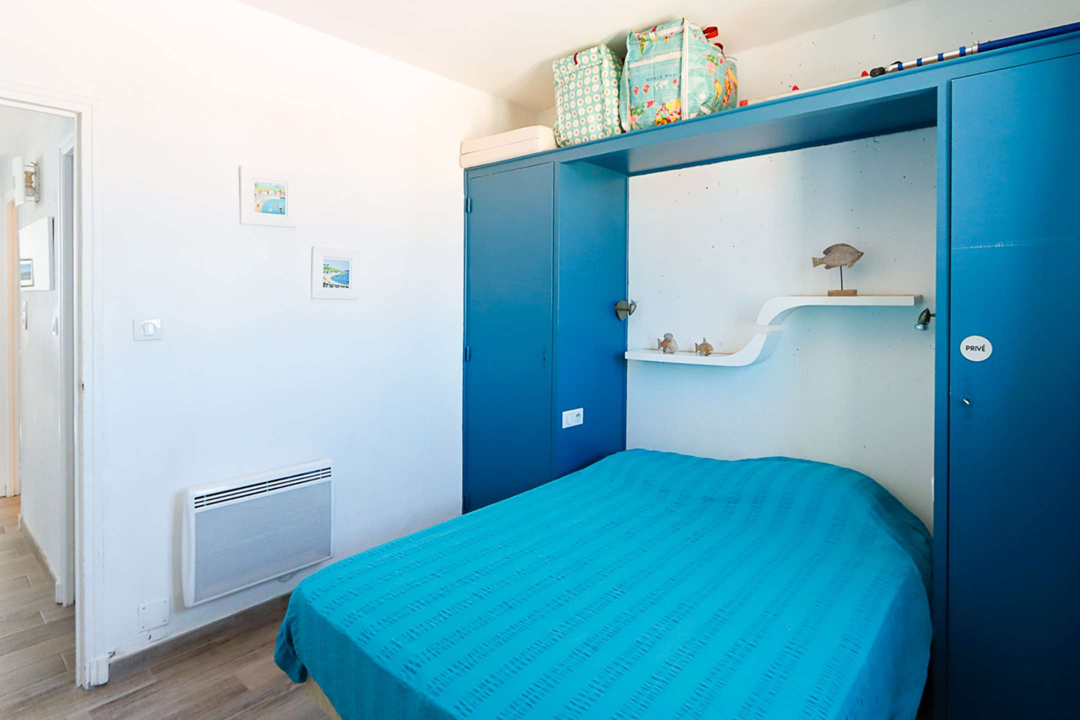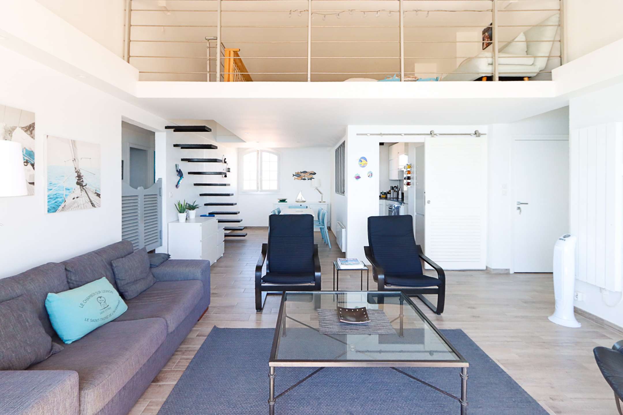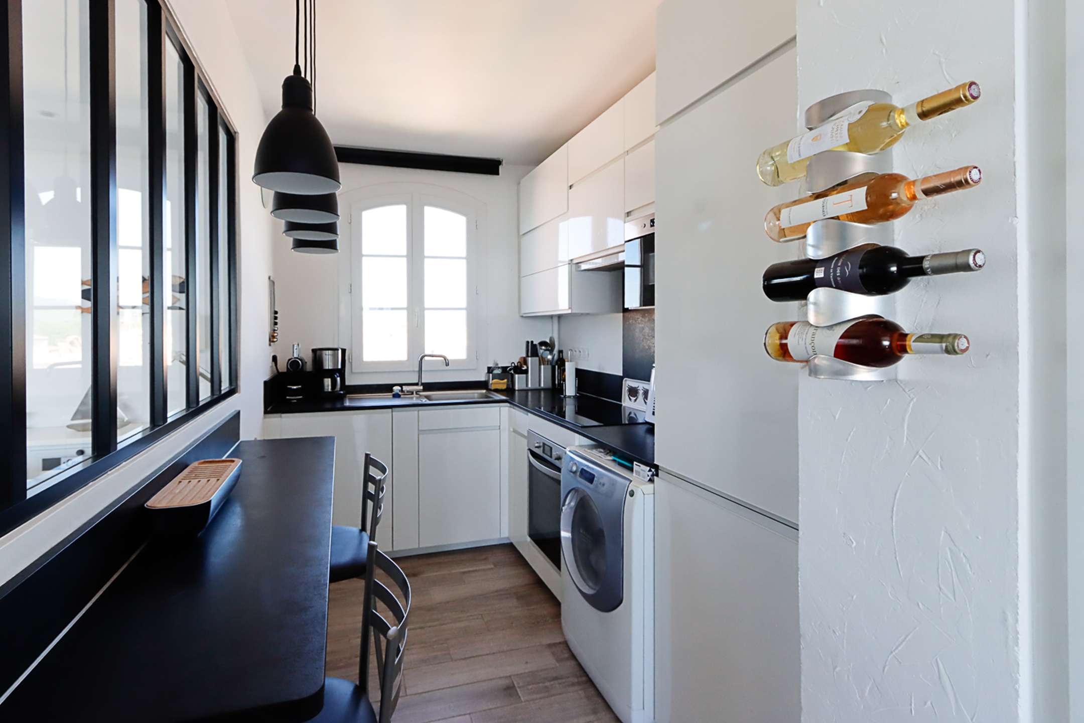 The apartment is composed of a bright dual aspect living-room, a separate kitchen (washing-machine, dishwasher, oven, microwave, Nespresso coffee-machine, fridge with a freezer), a shower-room, separate toilets, 2 bedrooms with a double bed (160cm and 140cm) and sea view and 1 bedroom with a double bed (140cm) and a view on Port Grimaud.