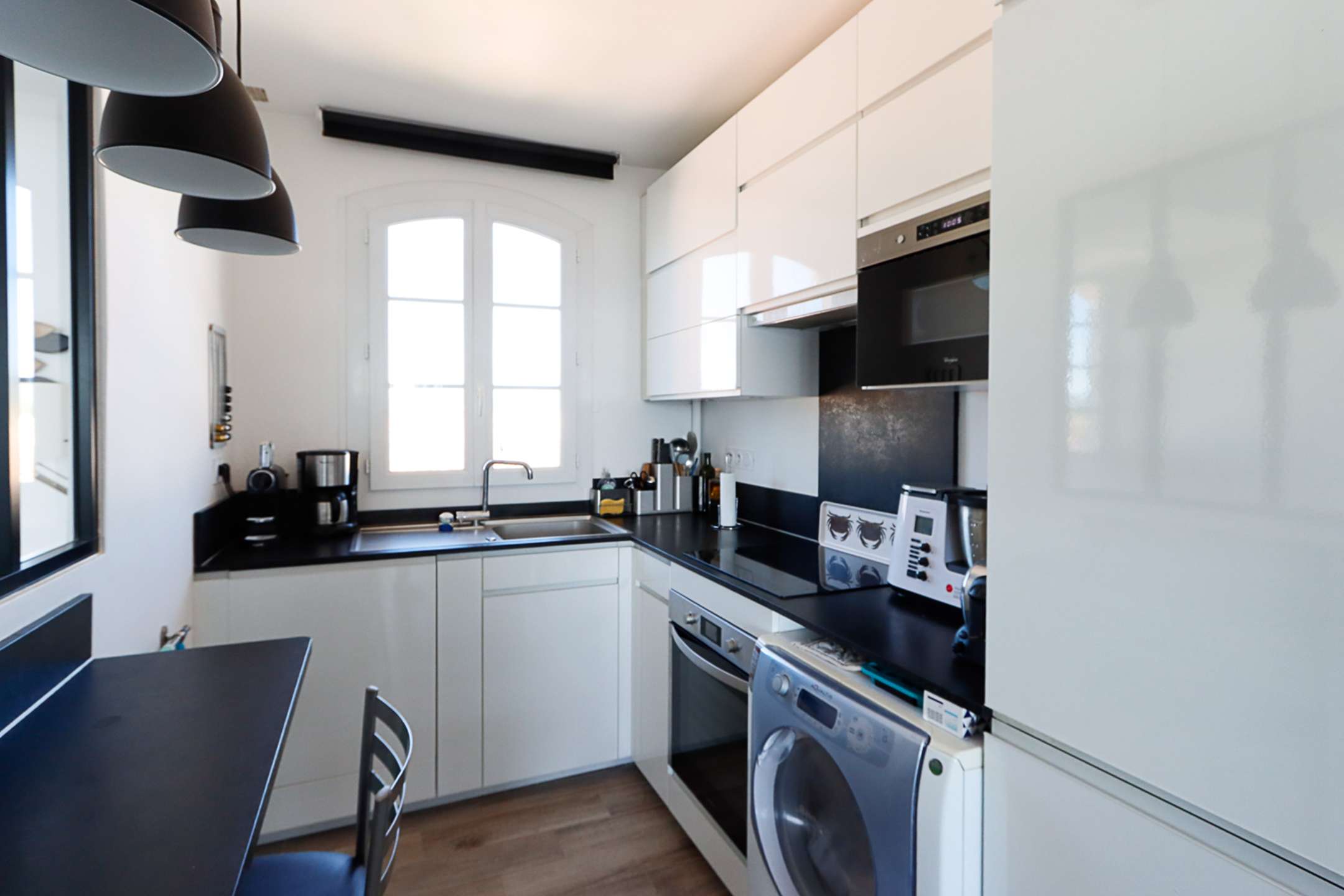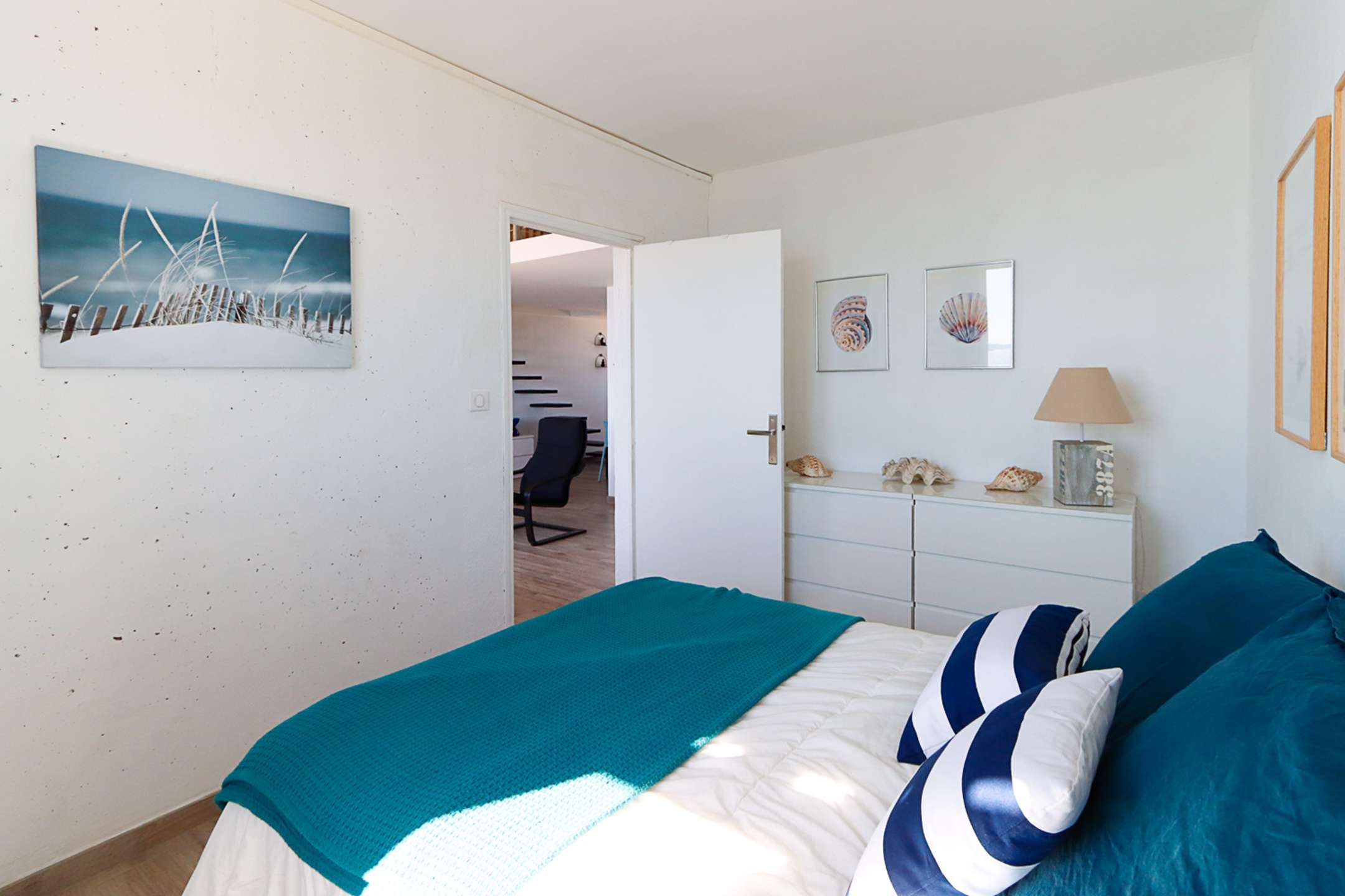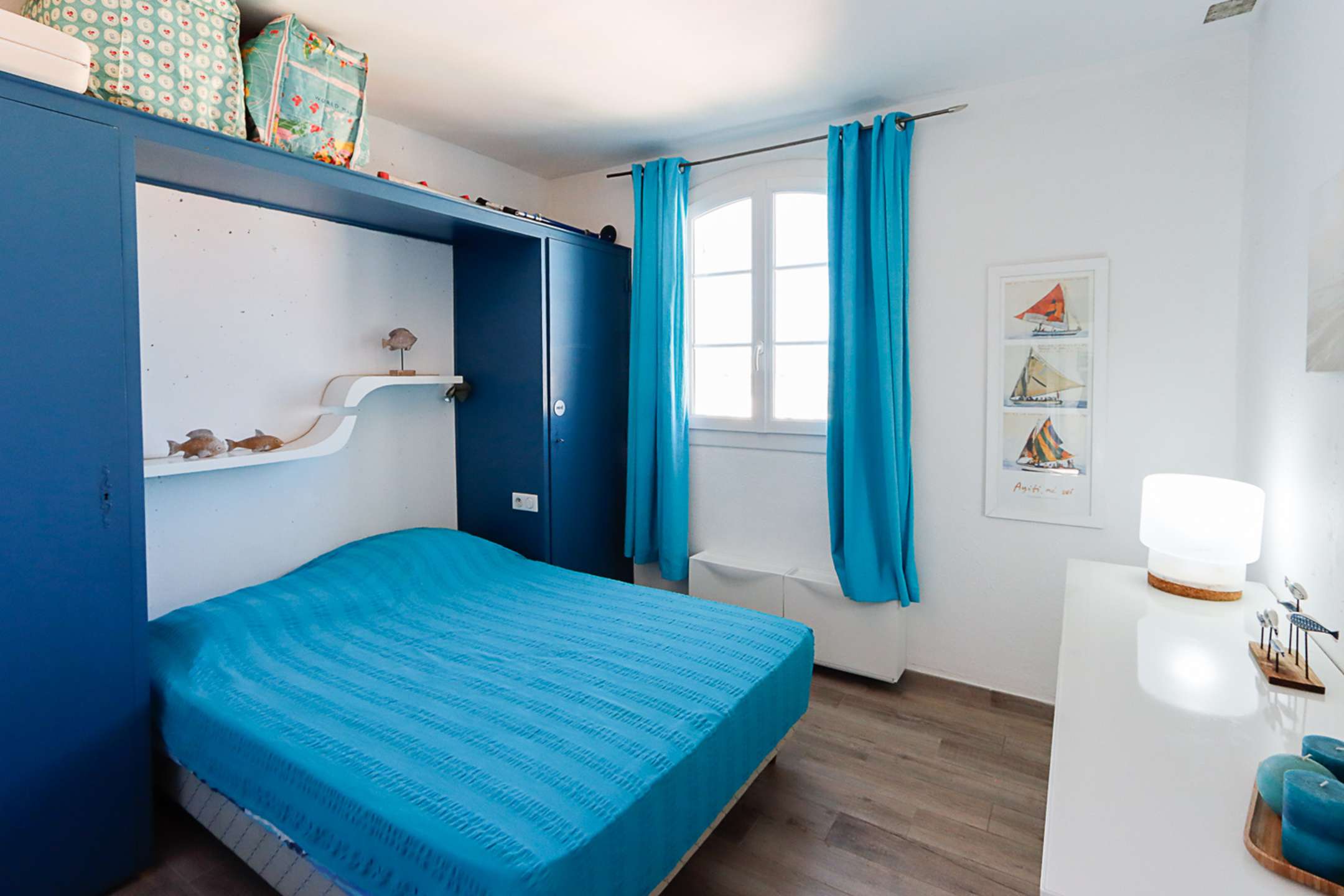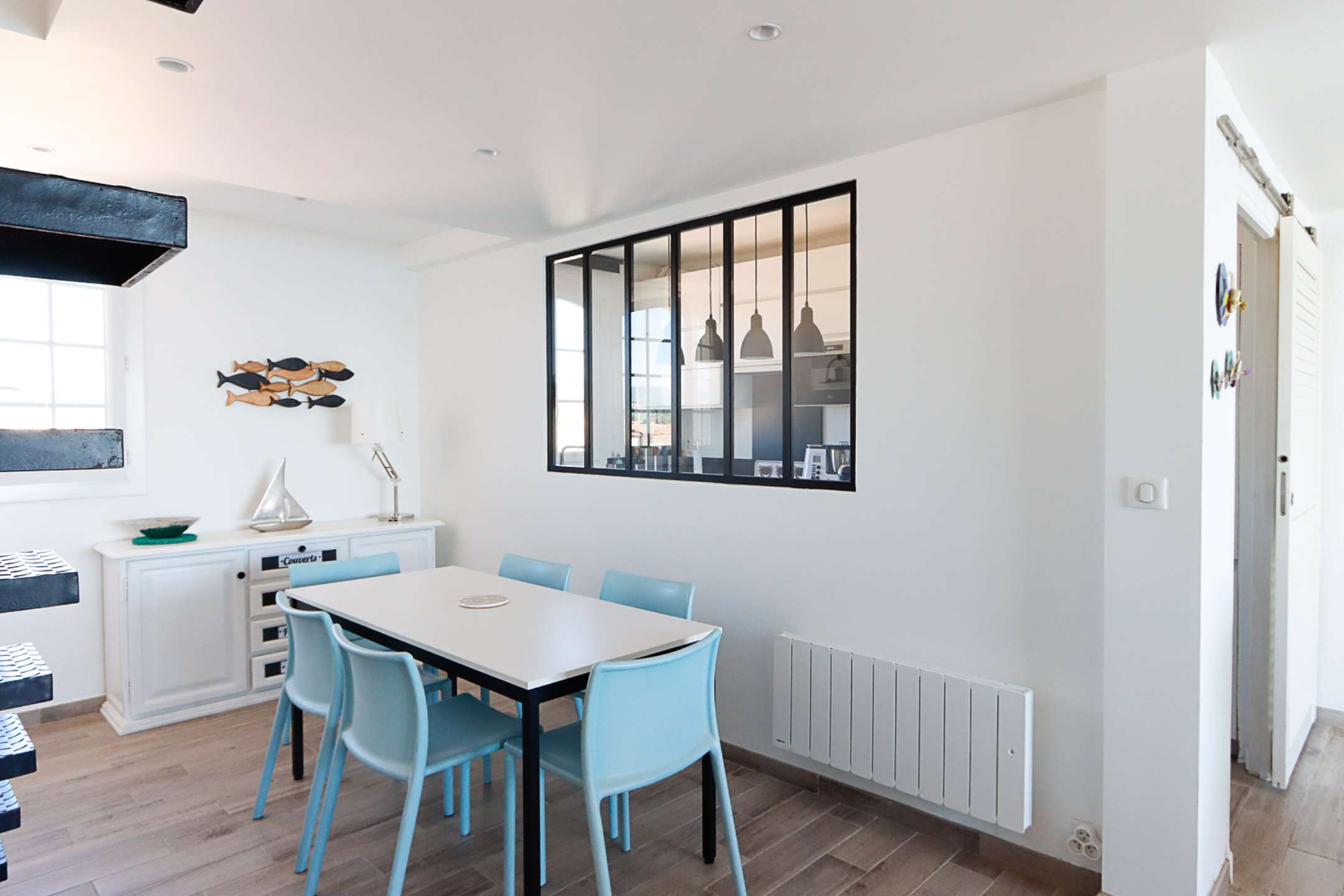 The apartment is composed of a bright dual aspect living-room, a separate kitchen (washing-machine, dishwasher, oven, microwave, Nespresso coffee-machine, fridge with a freezer), a shower-room, separate toilets, 2 bedrooms with a double bed (160cm and 140cm) and sea view and 1 bedroom with a double bed (140cm) and a view on Port Grimaud.
