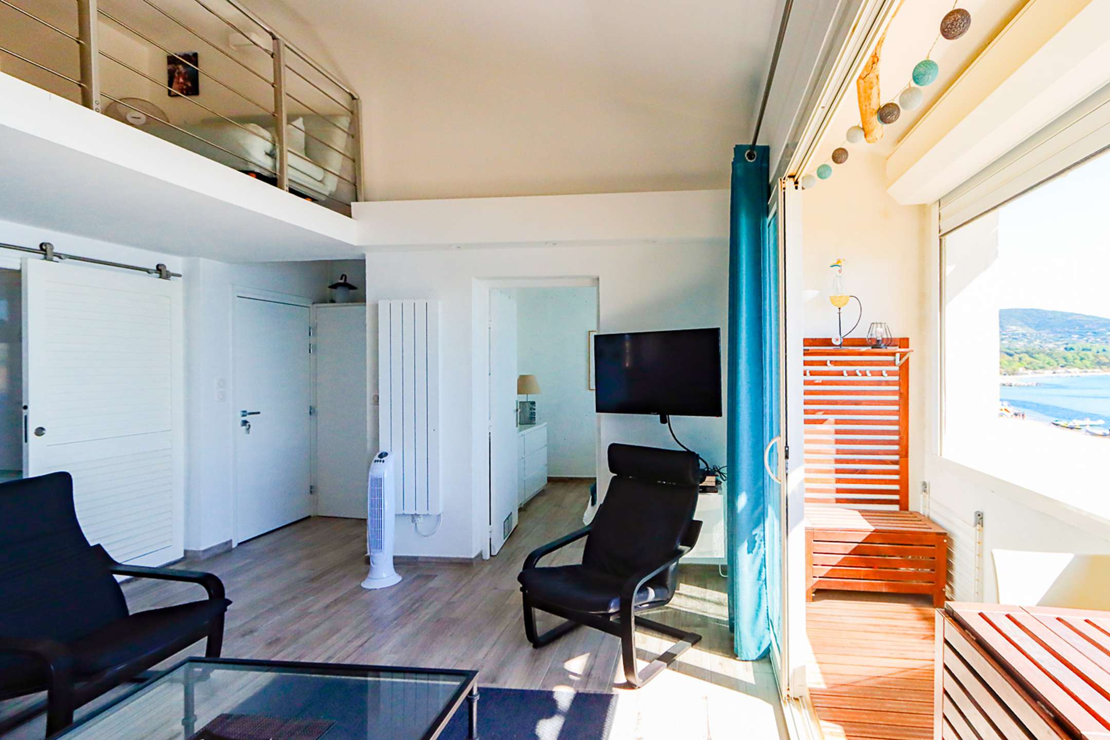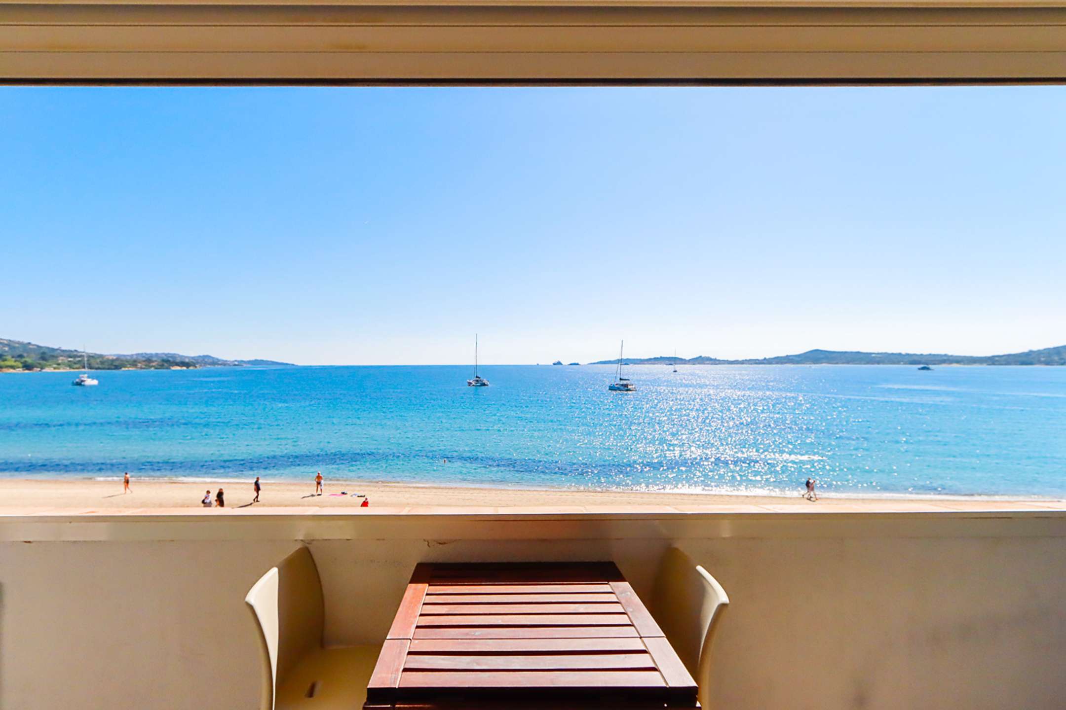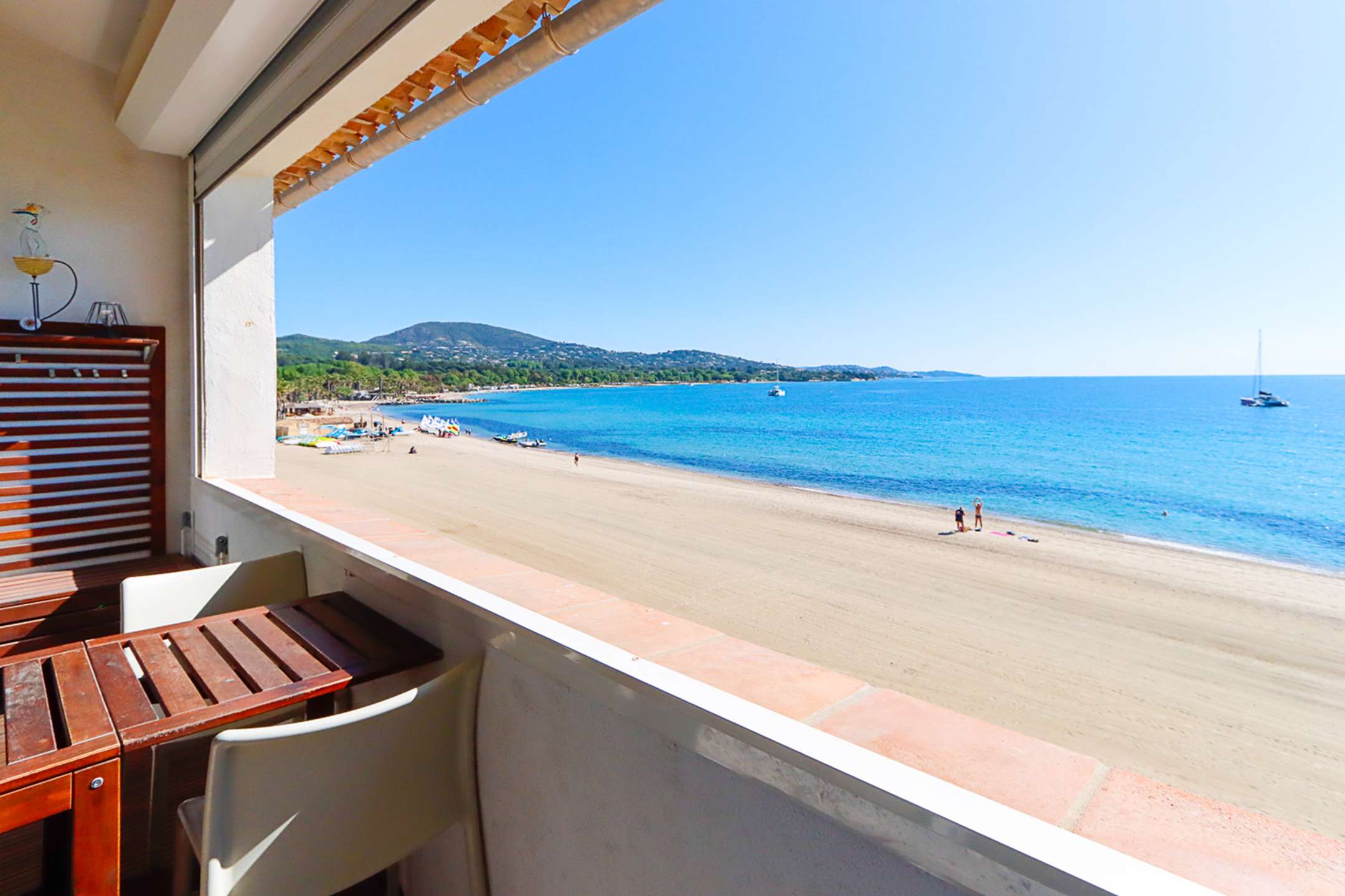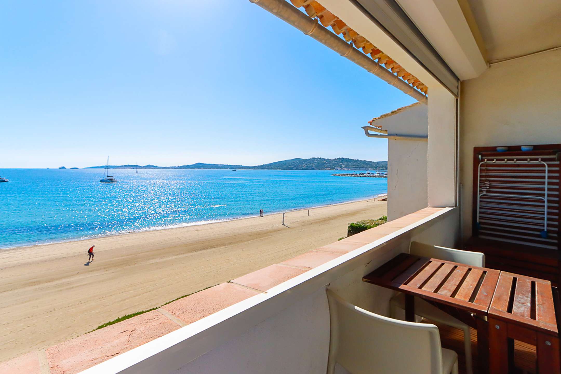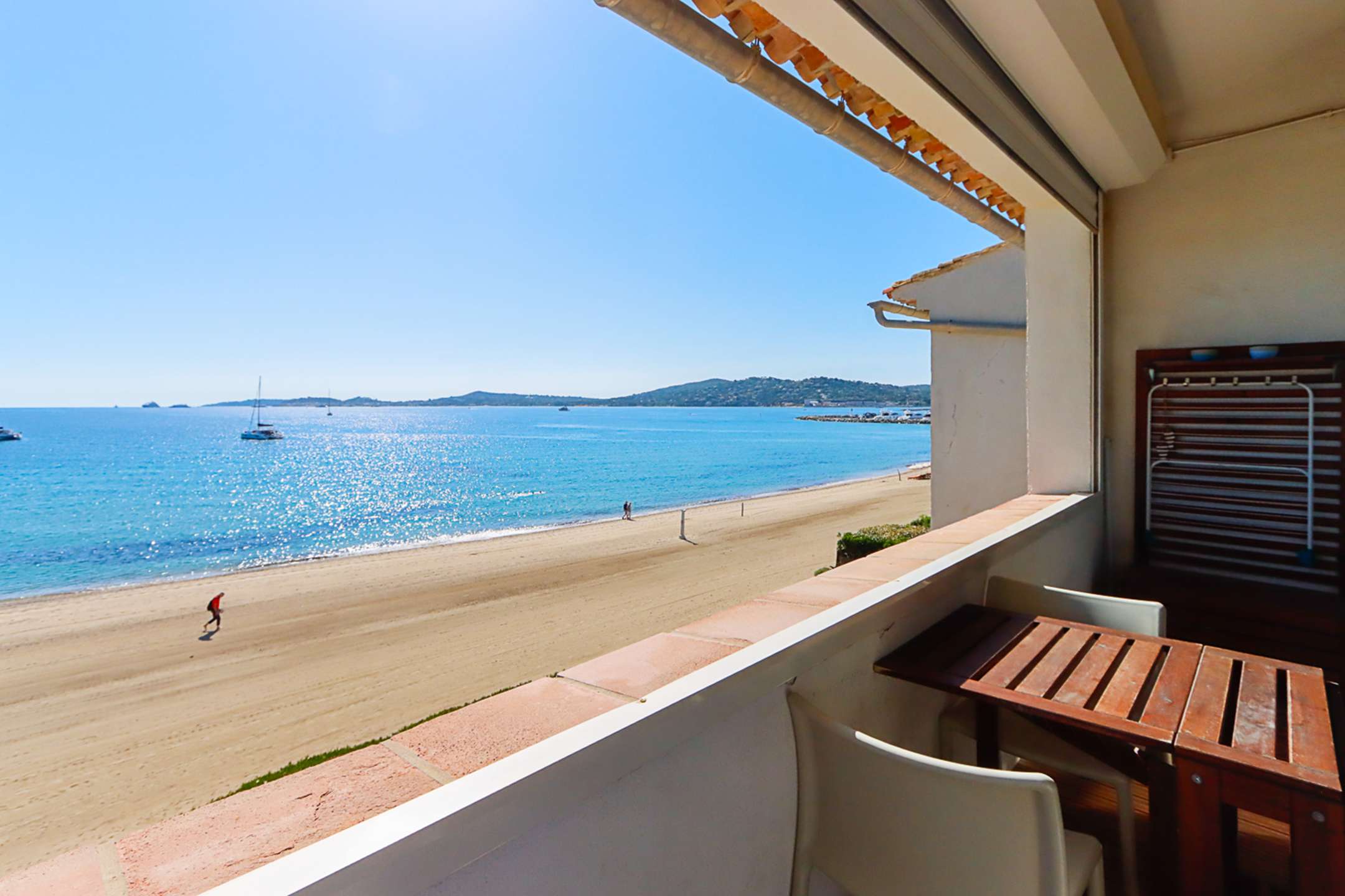 A balcony on the beach side with a view on the sea and Saint-Tropez.