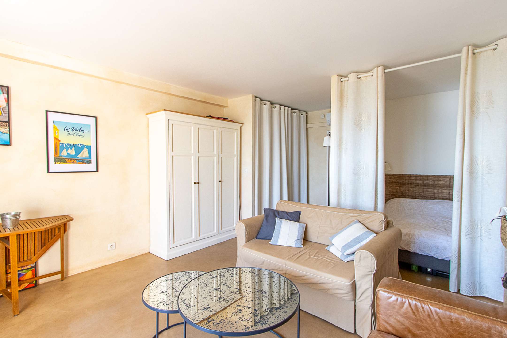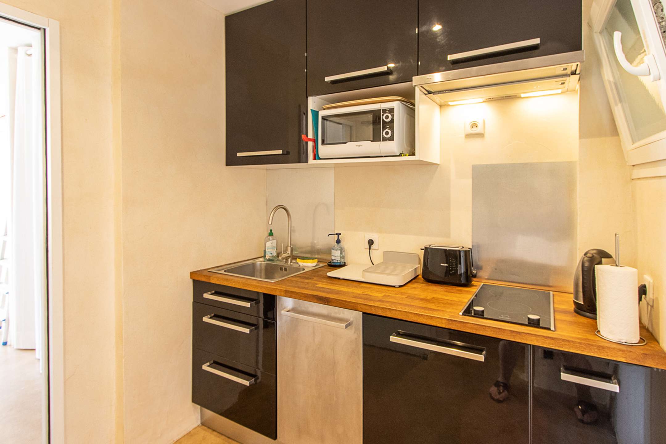 This beautiful apartment is composed of a living-room with a sleeping alcove, a small well-furnished kitchen (dishwasher, washing-machine, small fridge, microwave, toaster, kettle, Nespresso coffee-machine) and a shower-room with toilets.