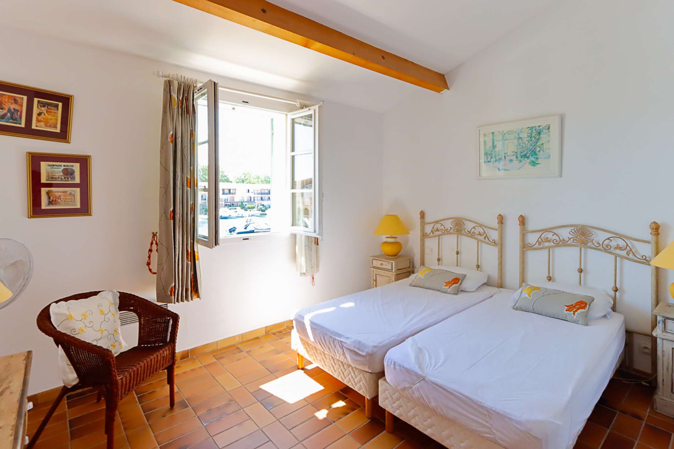 Au niveau supérieur, une chambre avec 2 lits simples réunis et sa salle de douche avec WC côté rue et une seconde chambre avec 2 lits simples réunis pouvant être séparées et sa salle de bains côté canal.