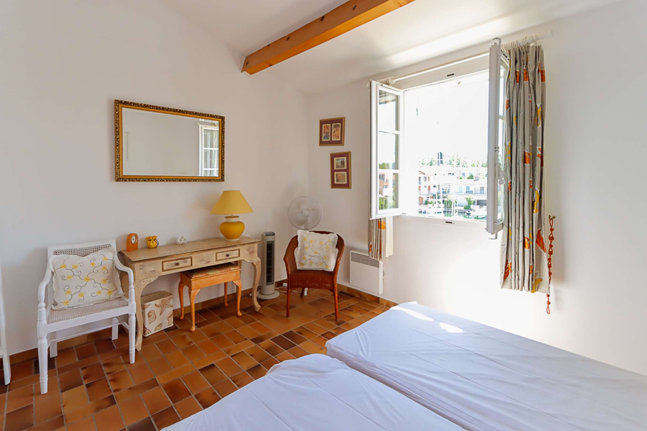 Côté canal, une terrasse ensoleillée idéale pour profiter du soleil tout en admirant la vue sur les bateaux et les collines.