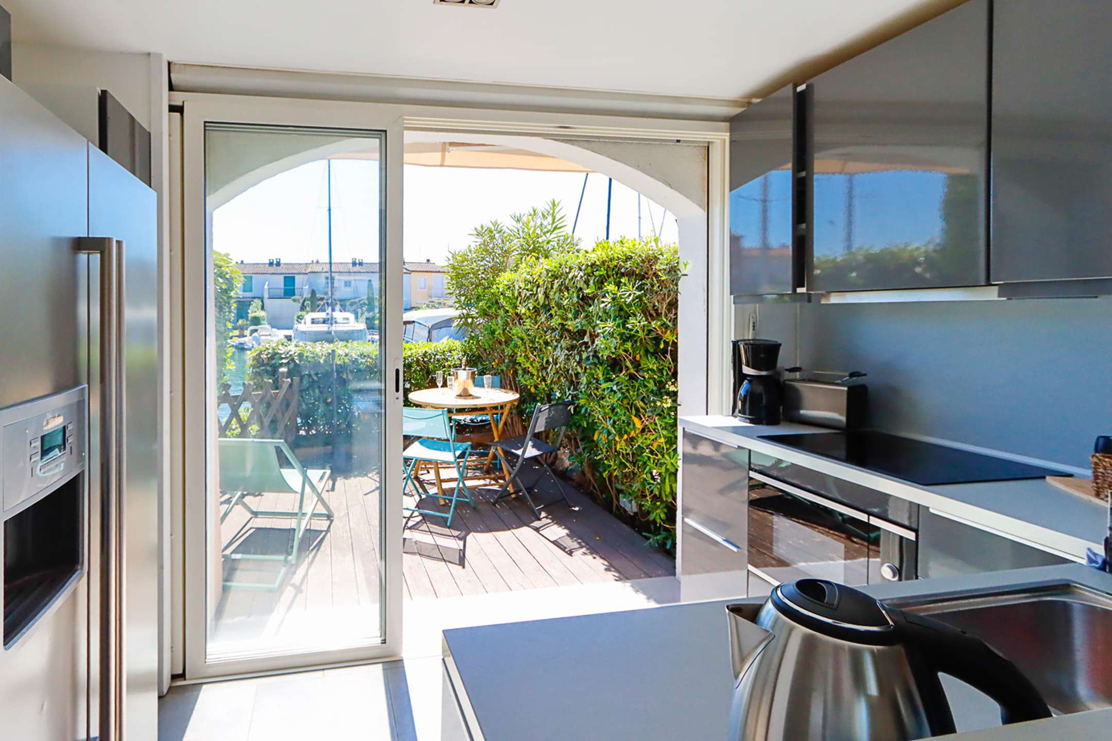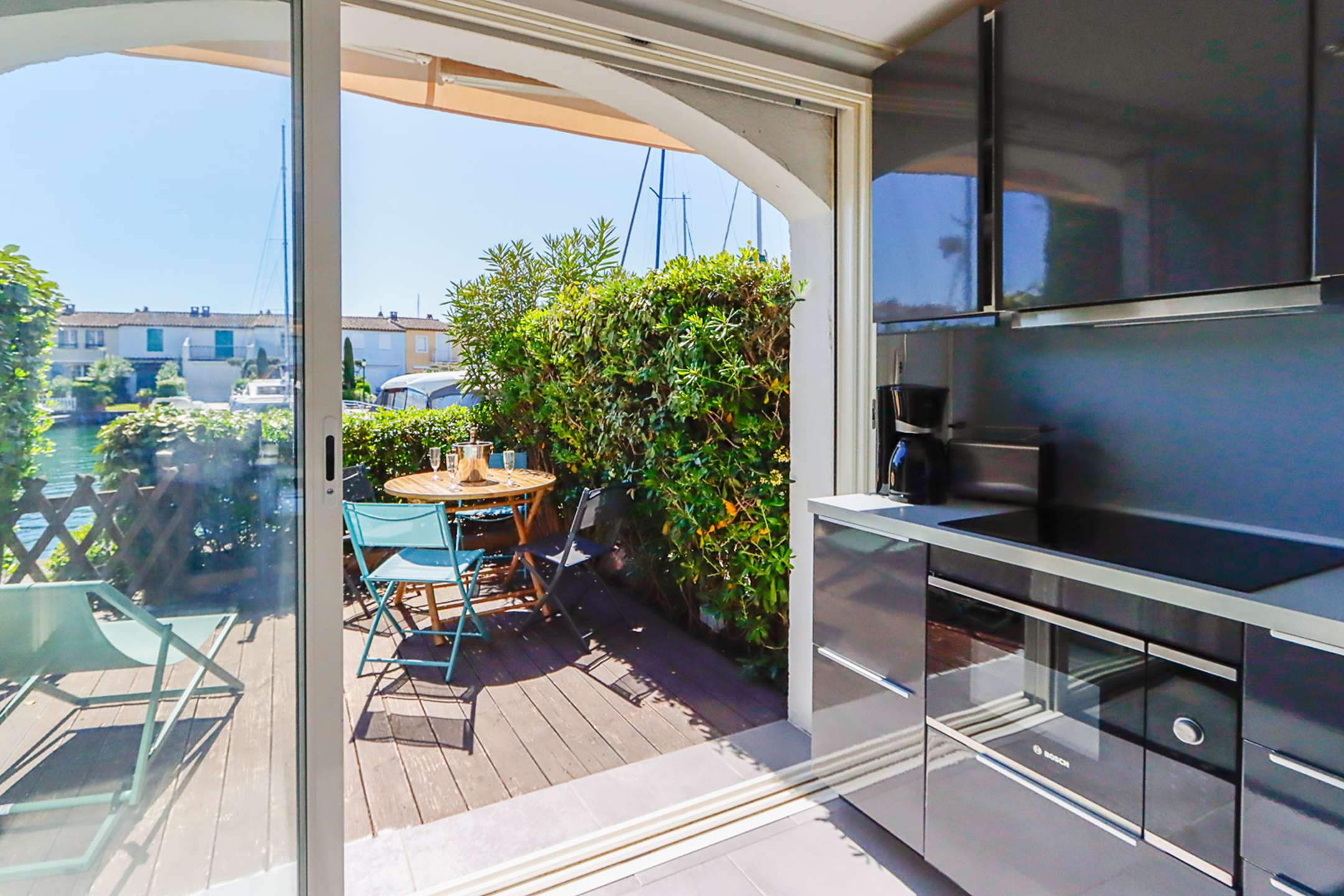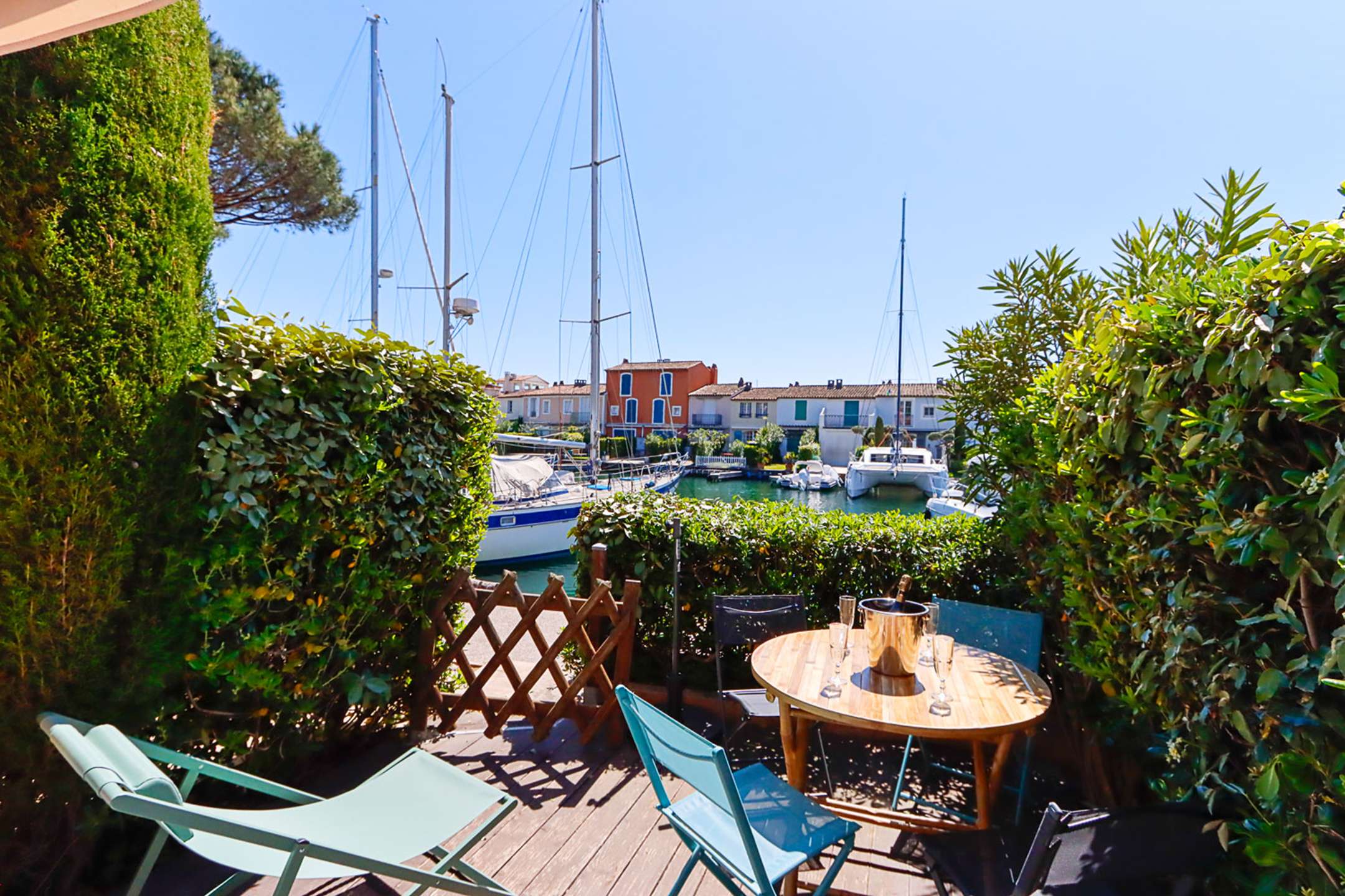 Terrasse avec vue directe sur les canaux et les bateaux.