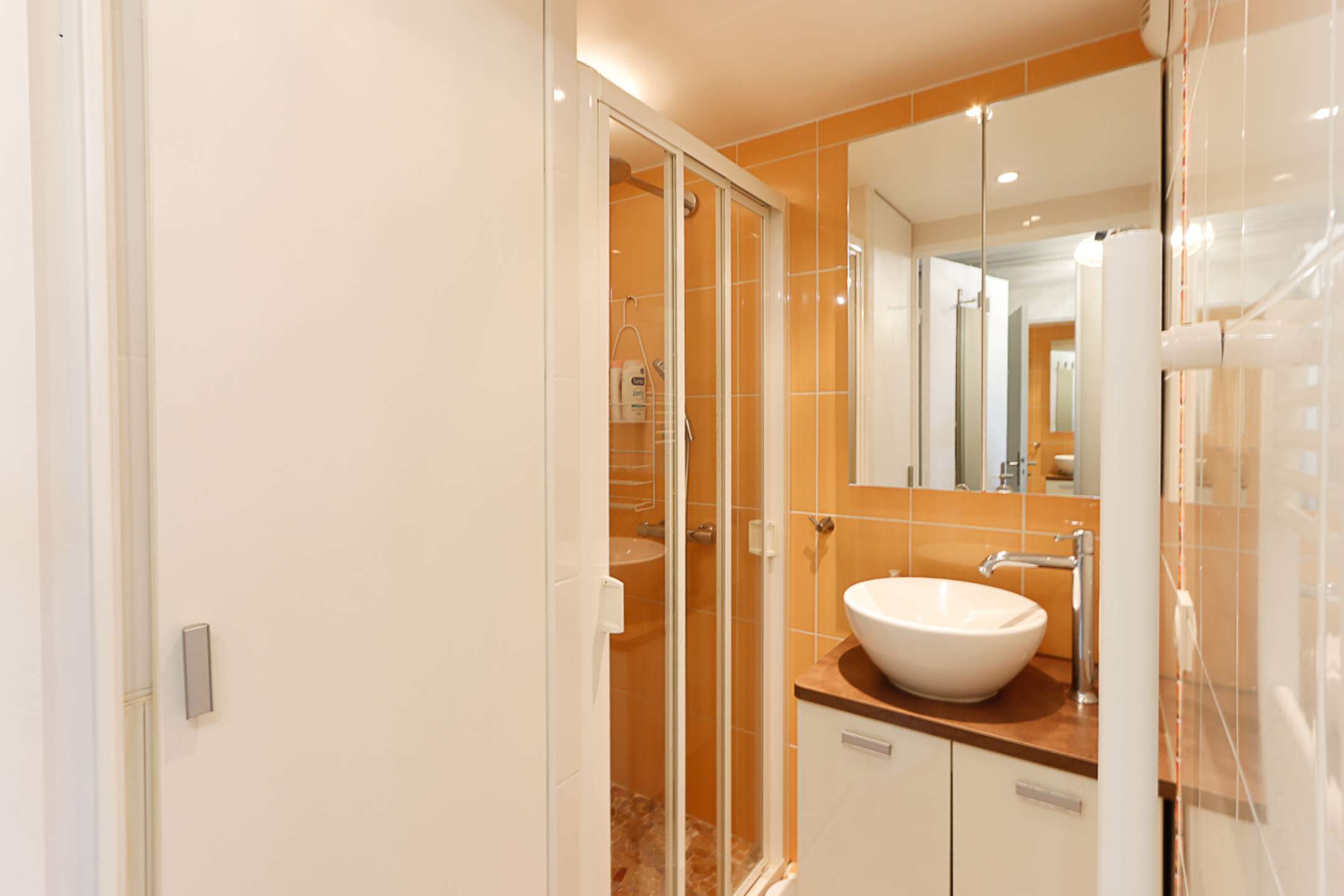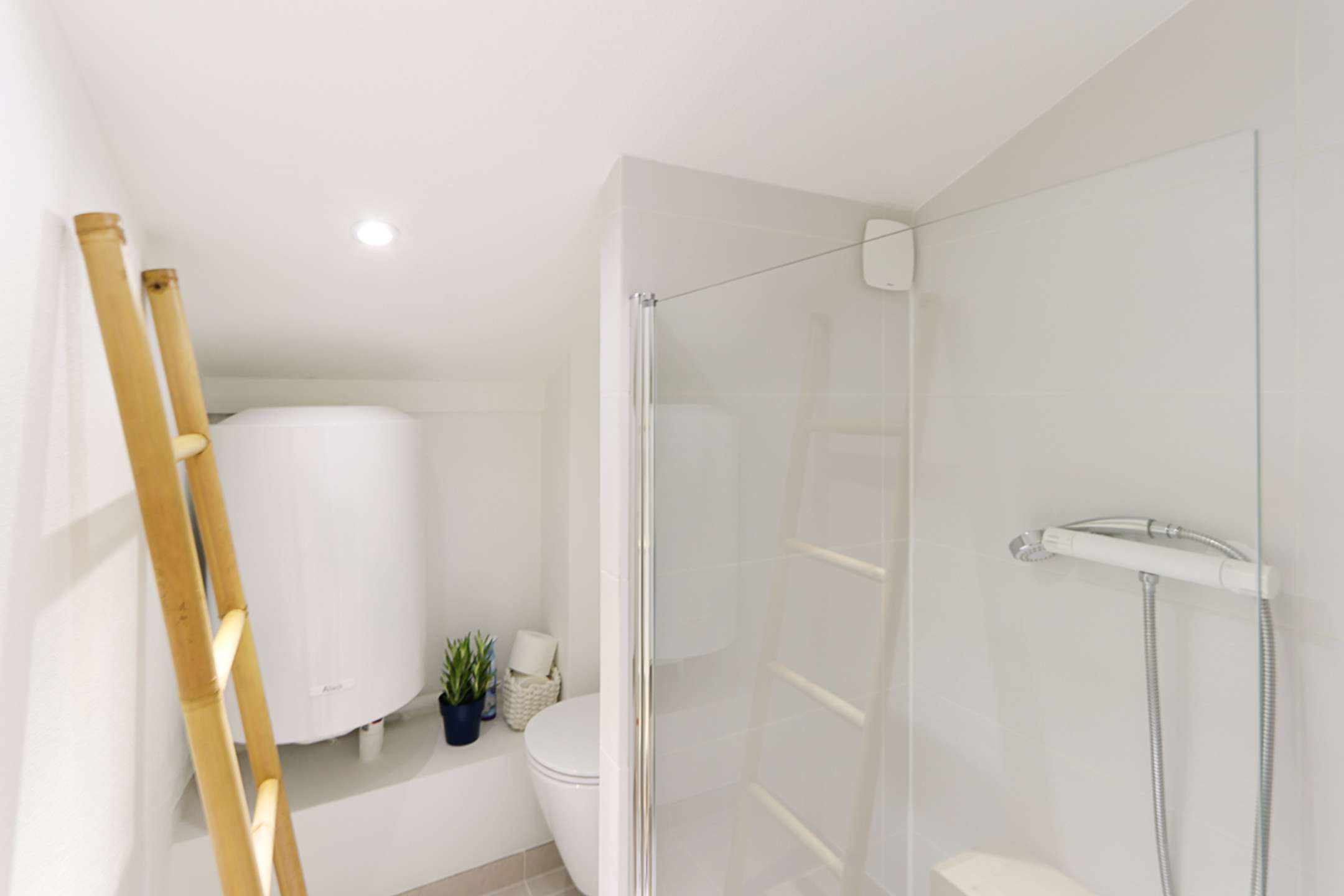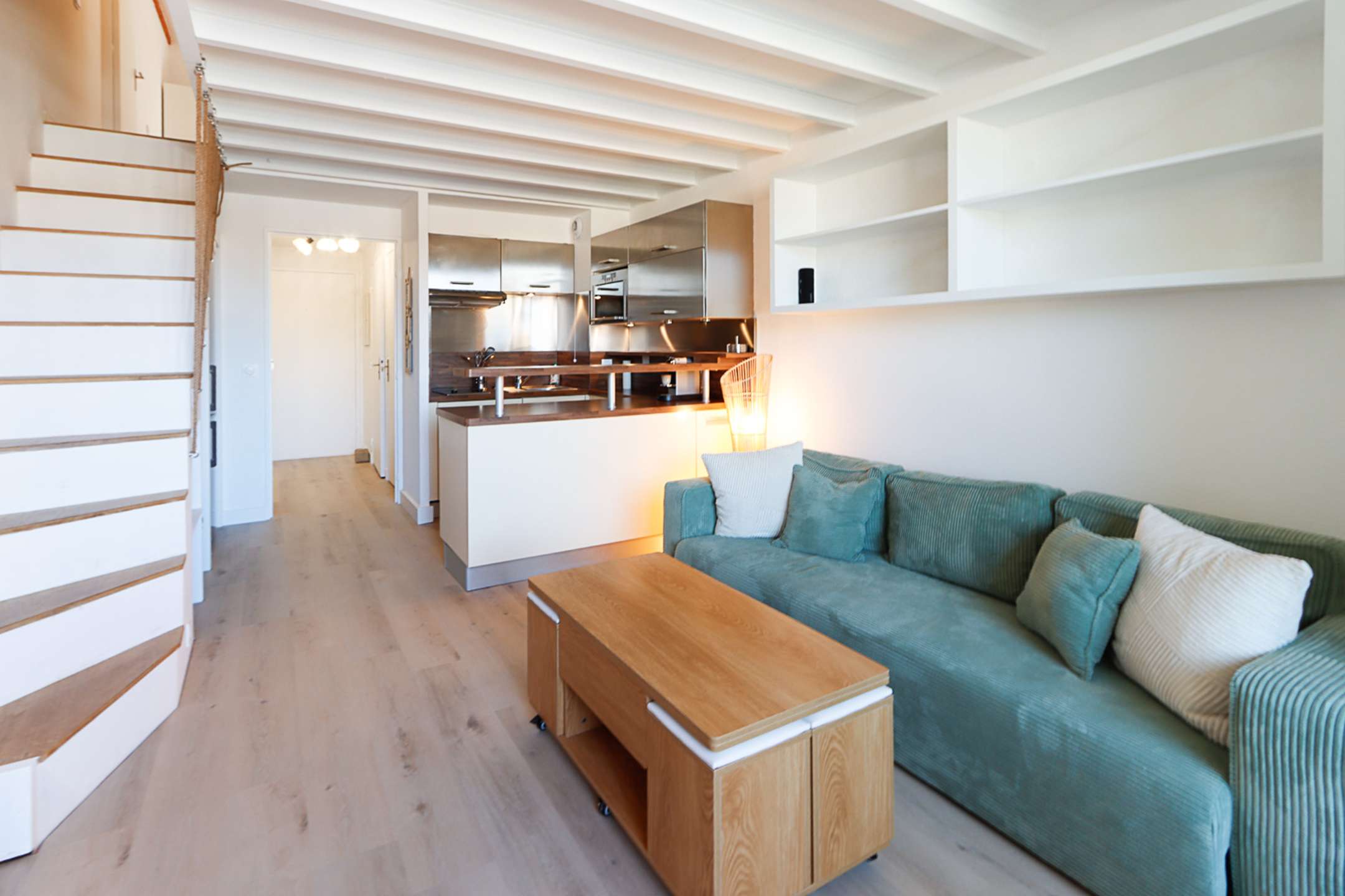 Au niveau inférieur, un salon lumineux avec cuisine bien équipée (lave-vaisselle, micro-ondes, réfrigérateur avec congélateur, Nespresso, bouilloire, grille-pain) et une salle de douche avec WC.