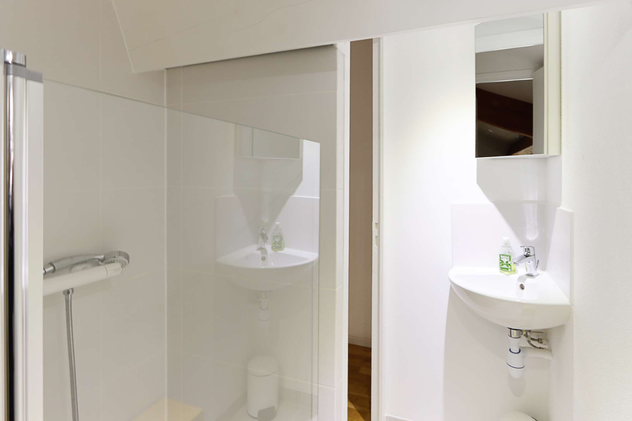 Au niveau supérieur, une chambre avec 2 lits simples réunis (lit 180cm), une seconde chambre avec lits doubles (160cm) et une salle d'eau avec WC (hauteur sous plafond limitée)