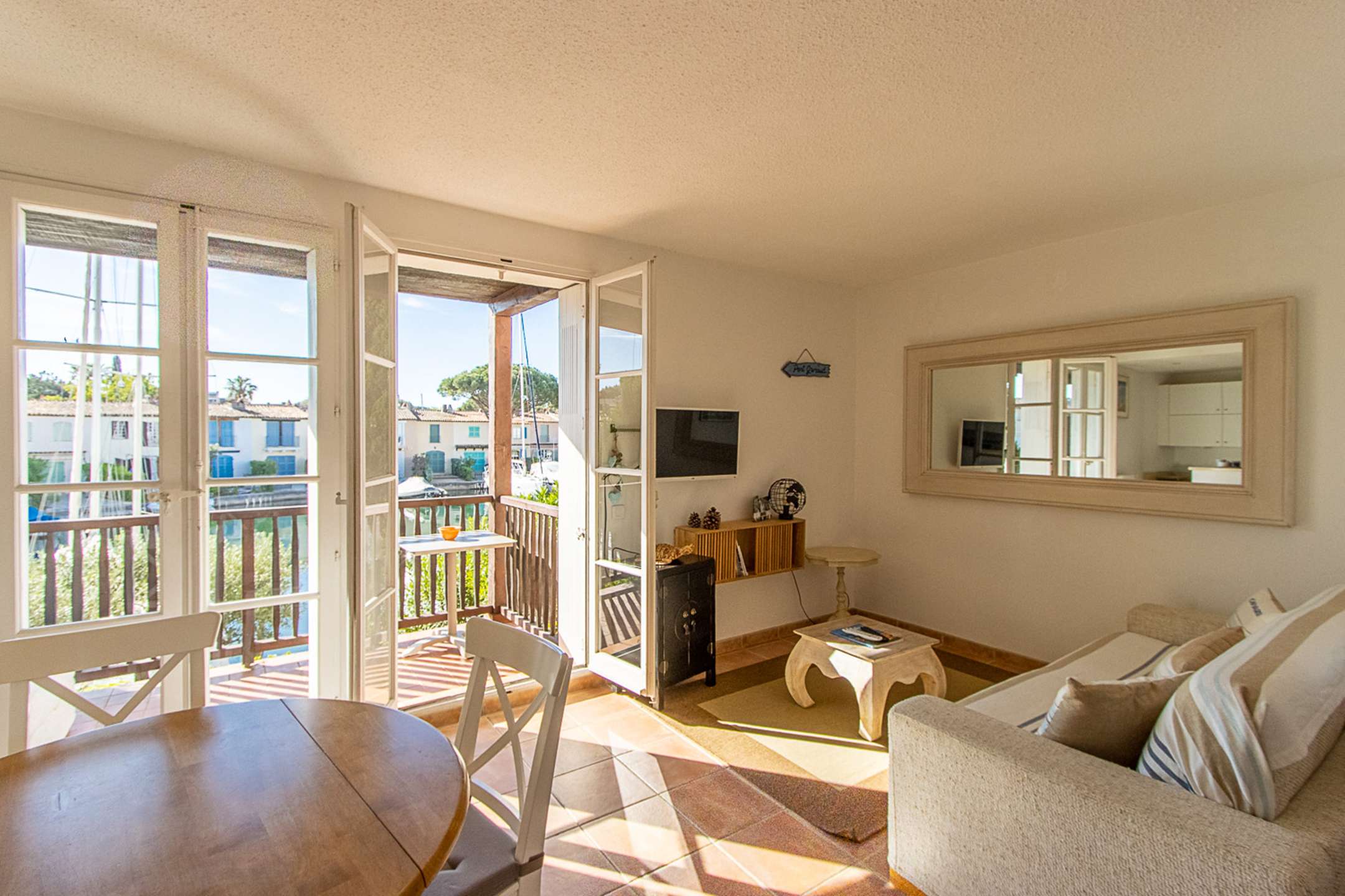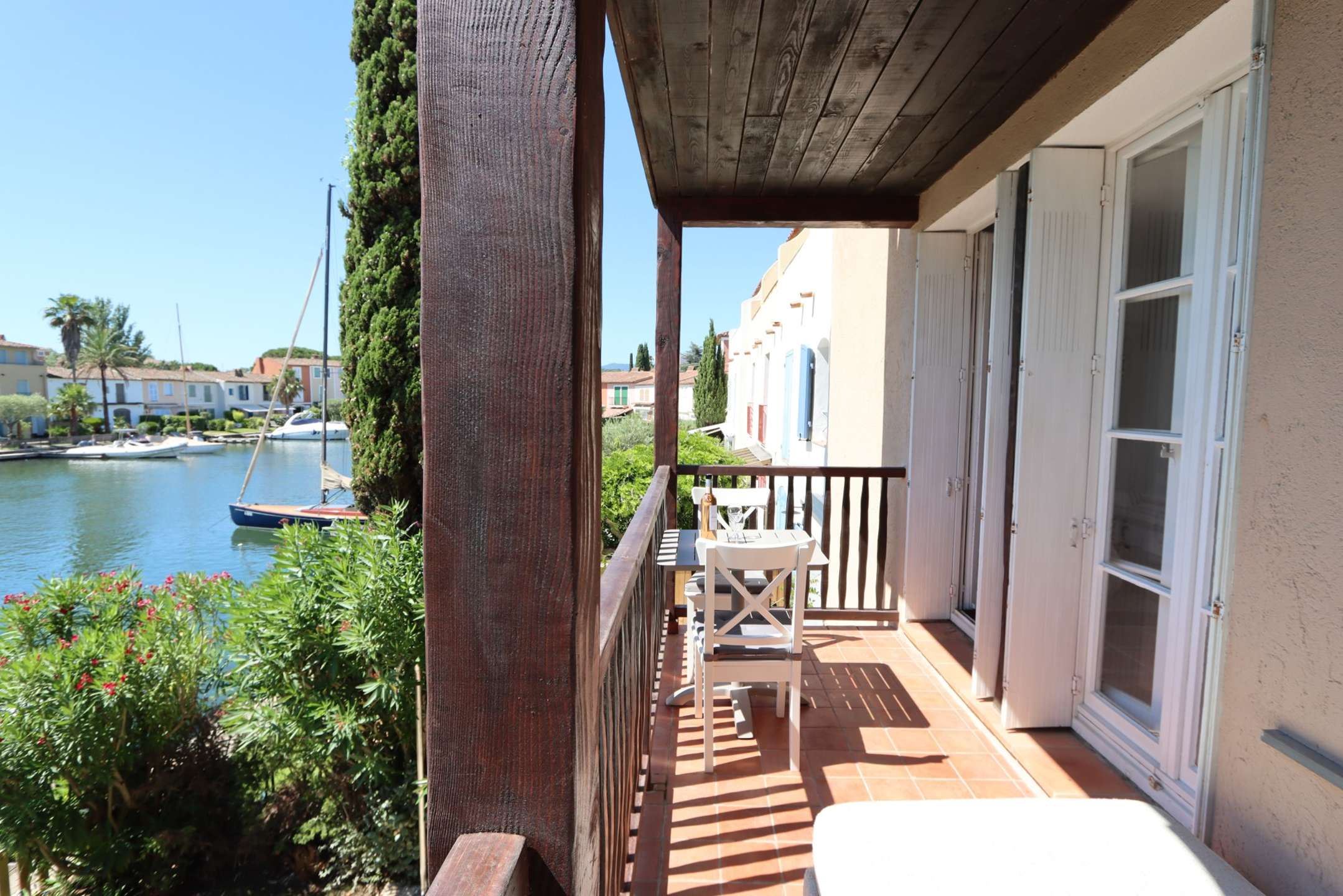 Côté canal, un grand balcon offrant une magnifique vue sur les bateaux et les maisons typiques de Port Grimaud.