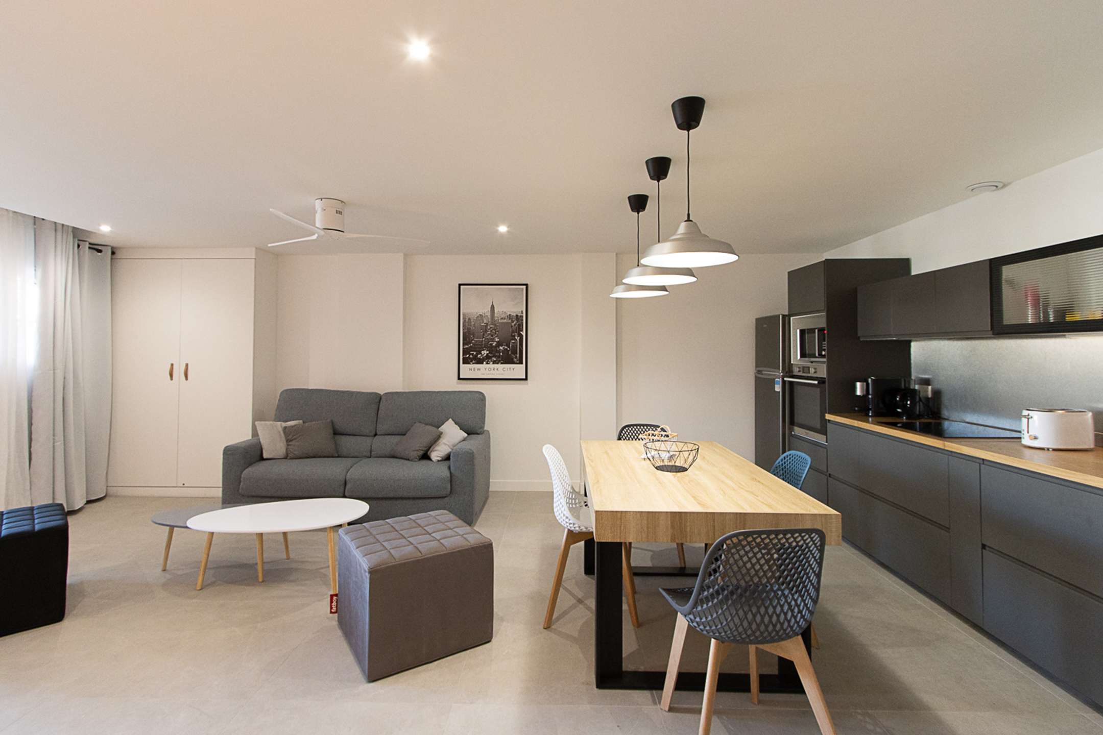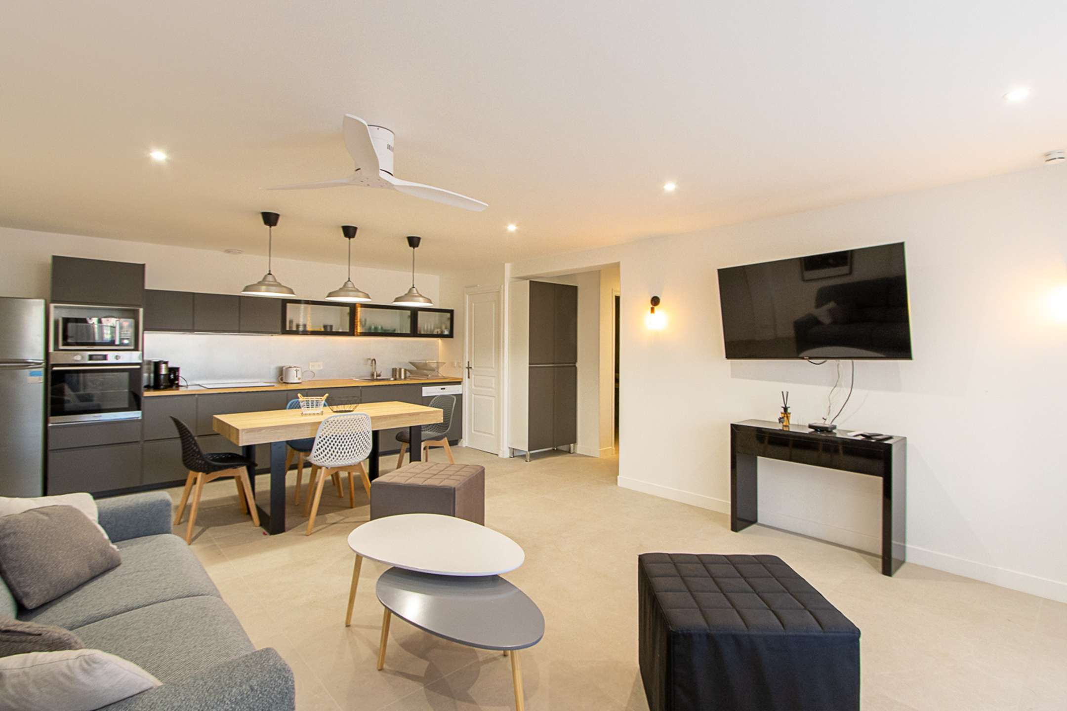 - un grand salon avec canapé-lit 160cm, une cuisine ouverte équipée (four, micro-ondes, réfrigérateur avec congélateur, Nespresso, grille-pain, bouilloire, lave-vaisselle, lave-linge séchant),