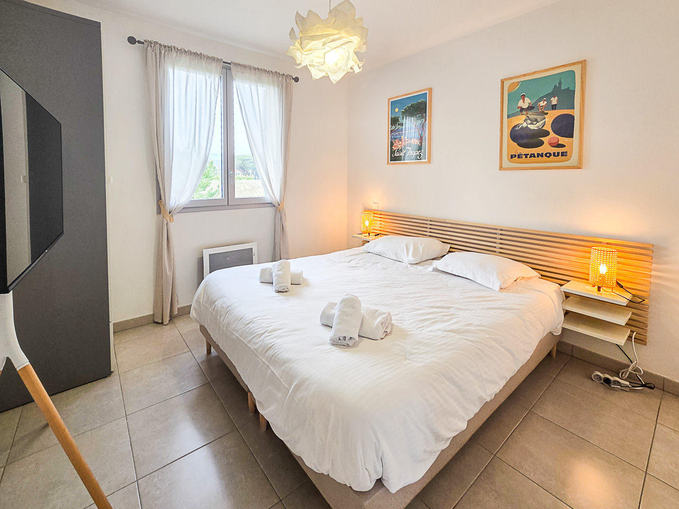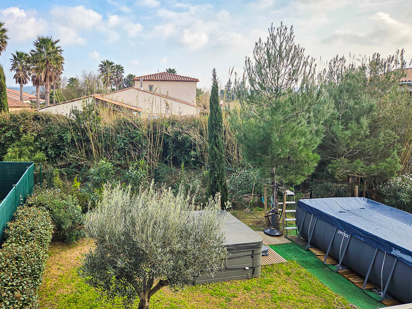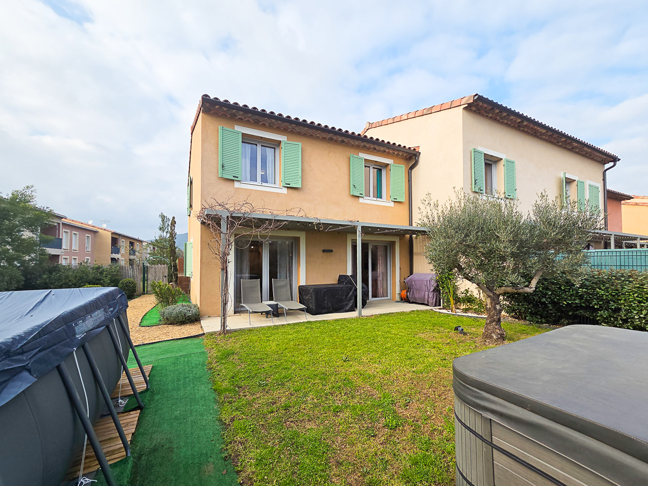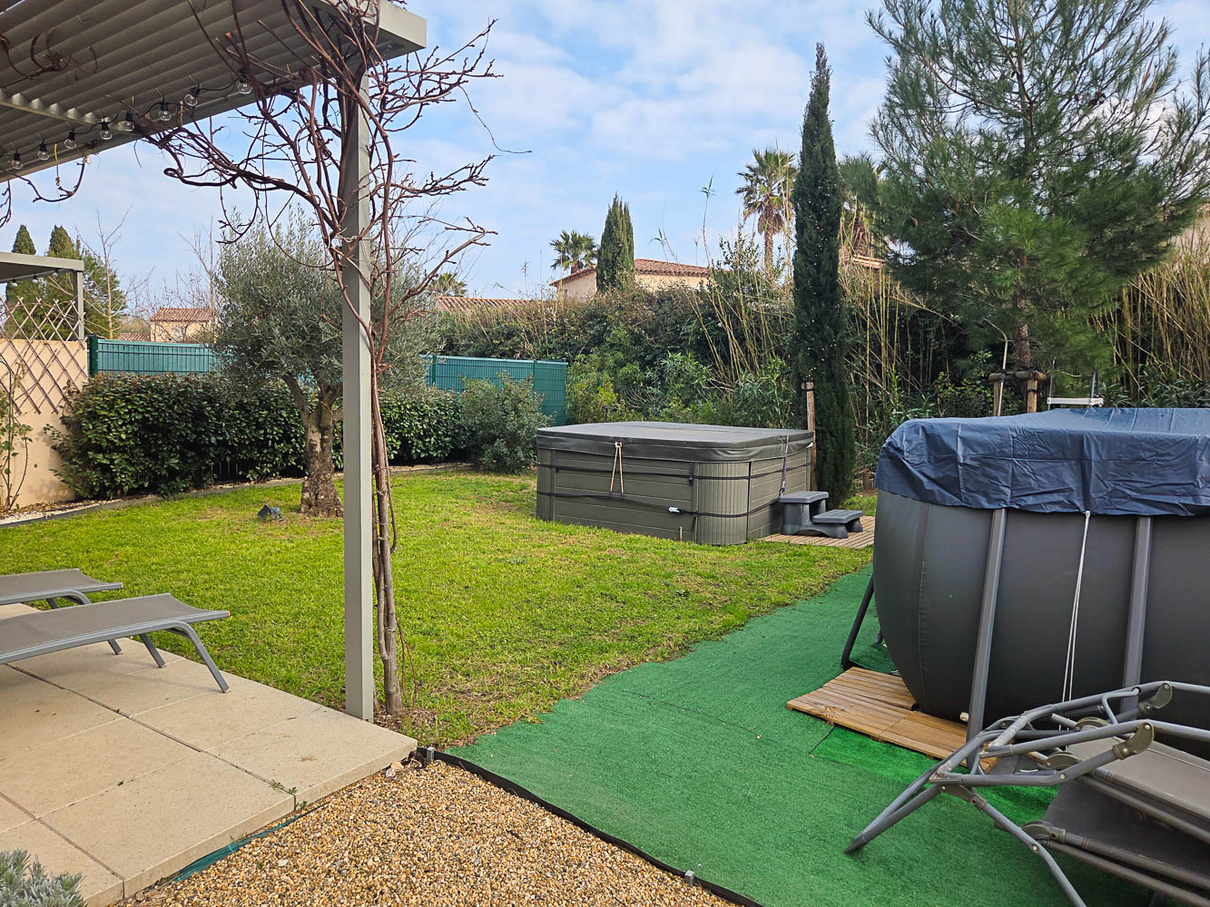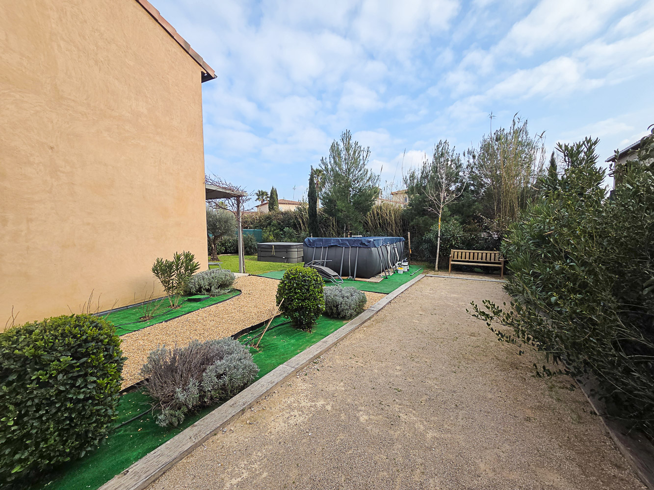 Mitoyenne d'un seul côté, elle dispose d'un jardin d'angle avec piscine hors-sol, jacuzzi et terrain de pétanque.