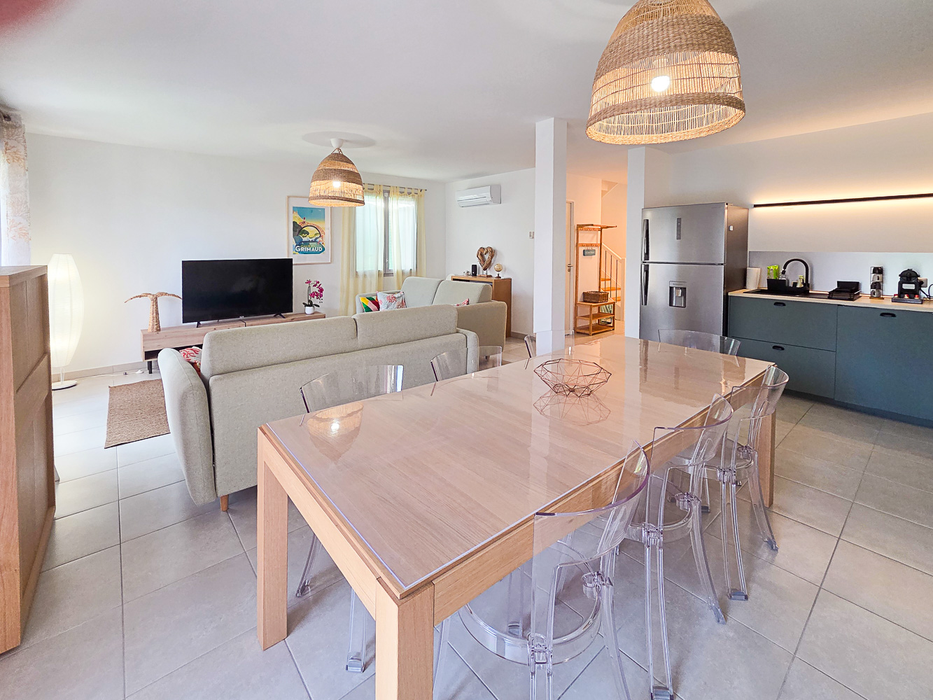 - au rez-de-chaussée: grand salon/ salle à manger avec cuisine ouverte, salle d'eau avec WC, cellier